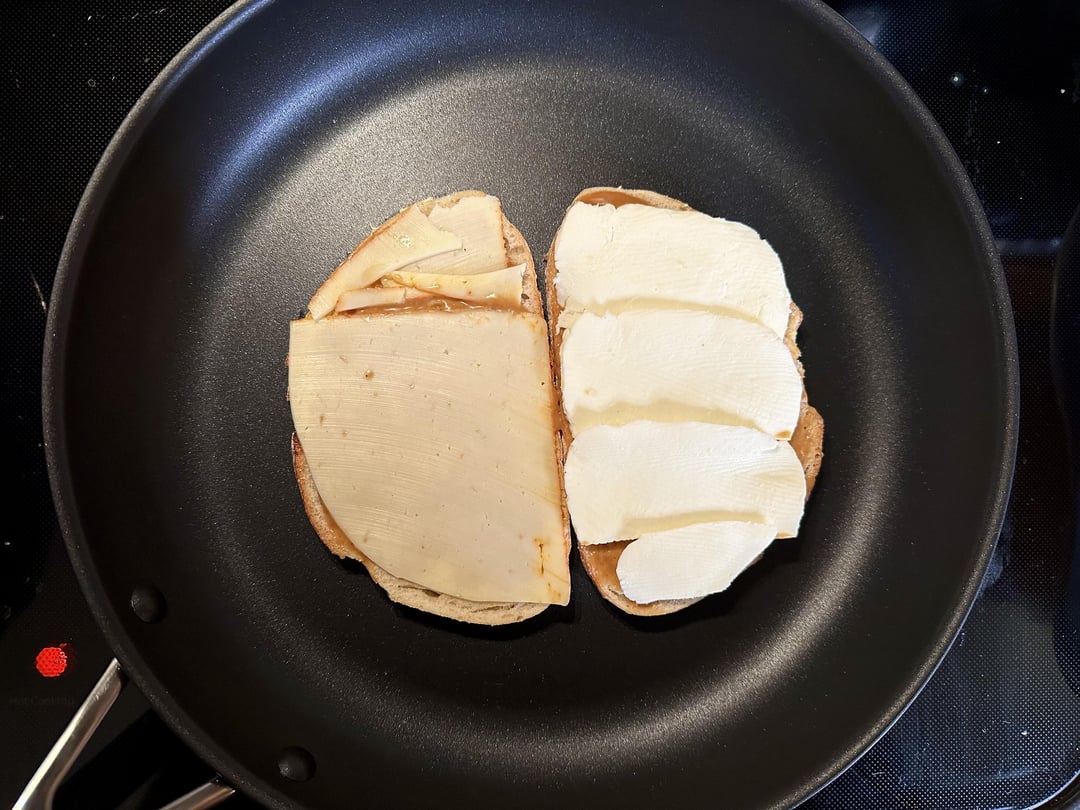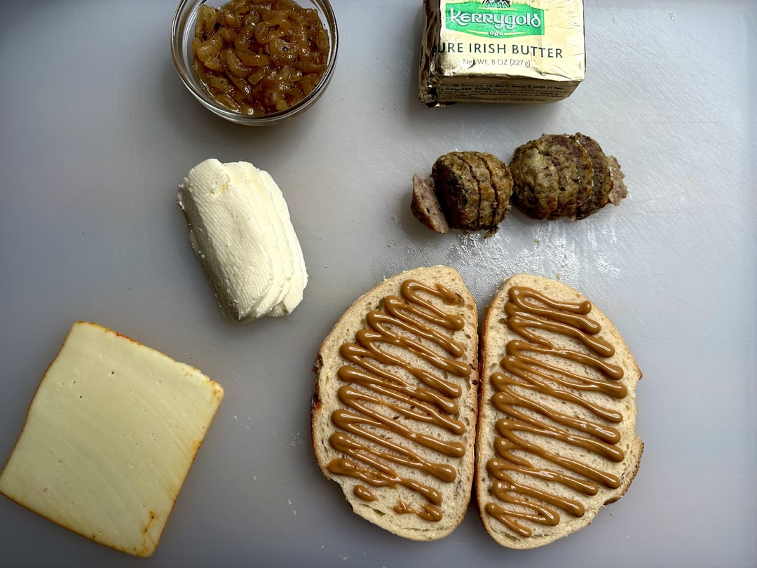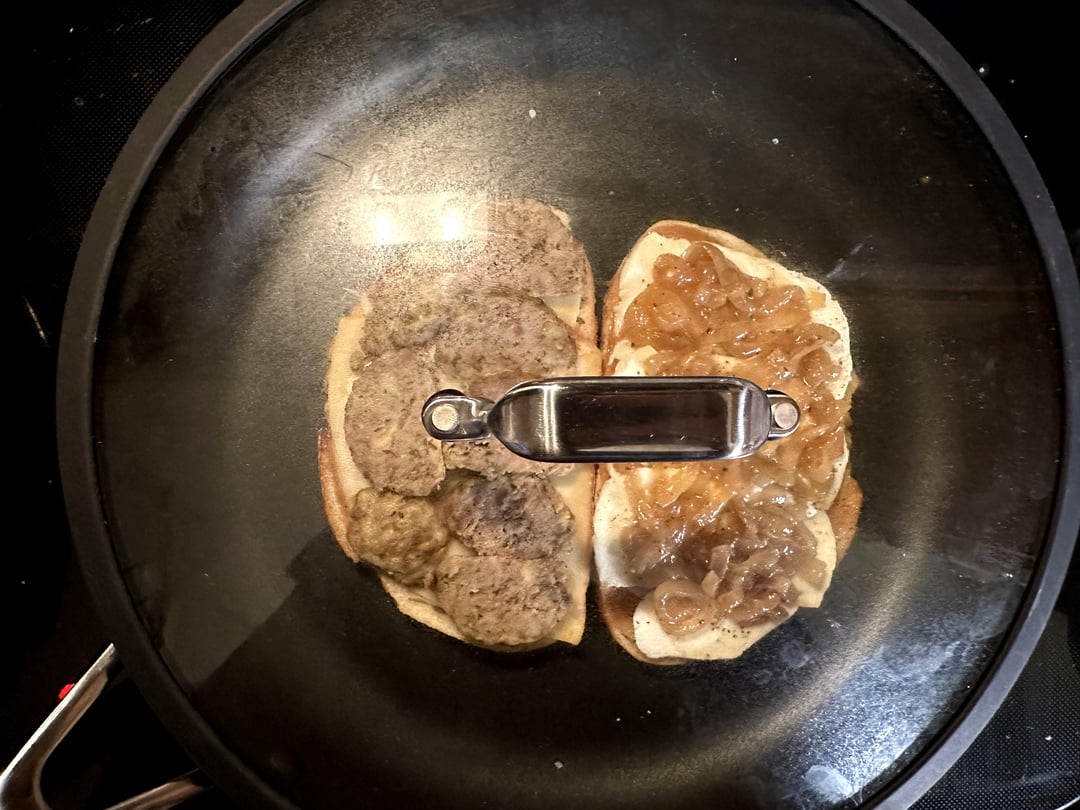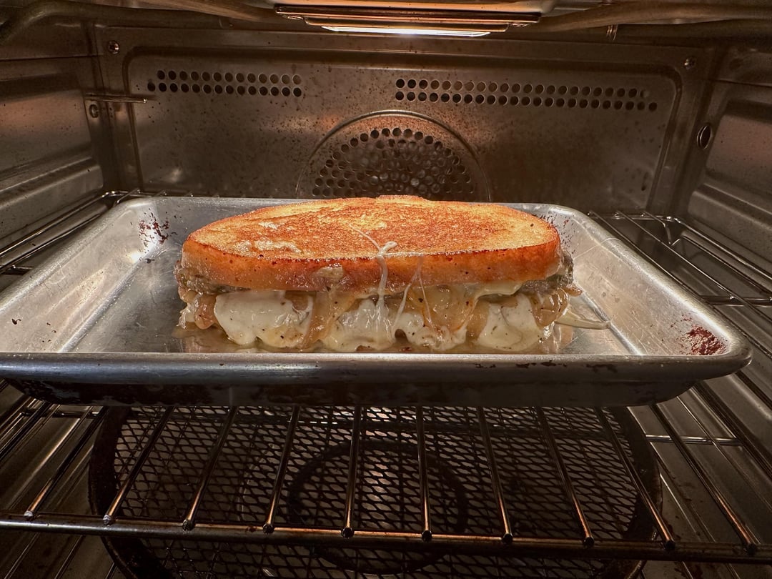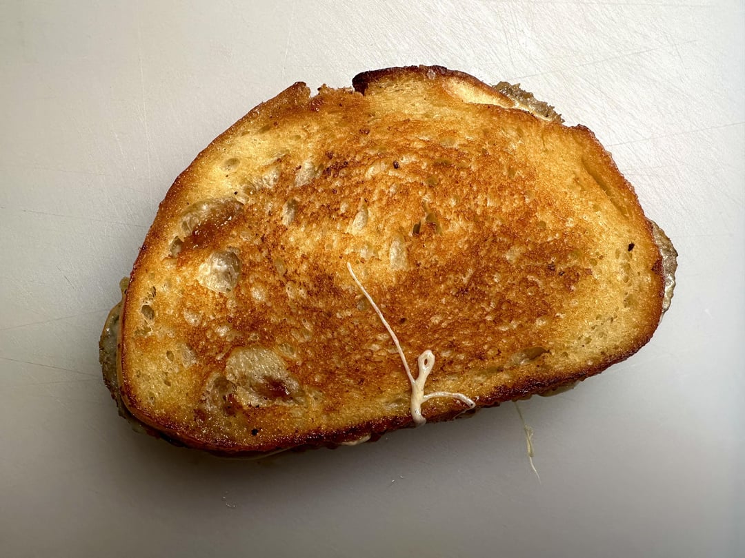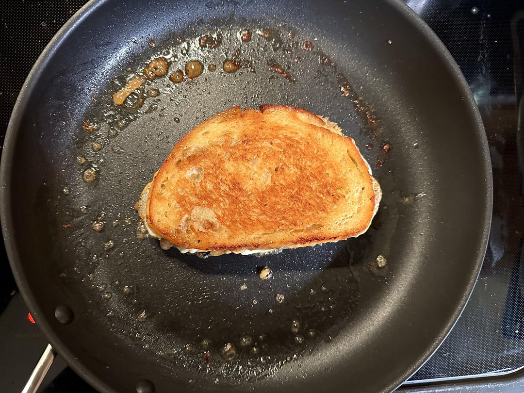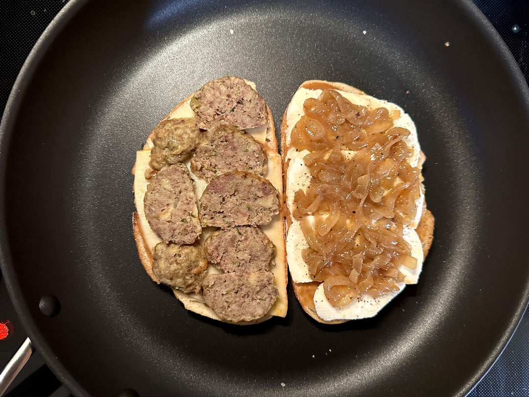 Italian country white with Kerrygold butter and a homemade soy aioli inside, Muenster, fresh mozzarella, sautéed onions, sliced homemade pork and beef meatballs, and a drizzle of hot honey for fun. Grilled in a pan with a cover and then a few minutes in the oven to make sure it was all melted.