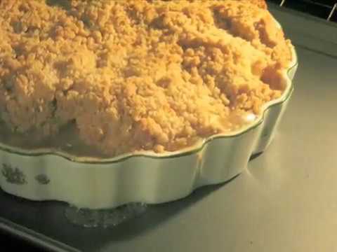 i’m cathie meister apple crisp is a wonderful dessert made by peeling coring and slicing apples chopping them with a flour butter and sugar combination and then baking it the episode the end of this video there will be a list of the ingredients and equipment needed you make a drink there are hundreds of varieties of apples buy six large or eight medium apples that are both tart and crisp like braeburns Granny Smiths or McIntosh they’re usually signs above the apples telling you if they’re good for baking pre-heat your oven to 375 degrees start by making the crumble topping put in a large bowl one cup of flour one cup of sugar a half a teaspoon of salt a teaspoon of ground cinnamon and a quarter teaspoon of ground nutmeg cut up 10 tablespoons of butter into small pieces and add them to the bowl using two kitchen knife one in each hand start slicing everything together you could use a pastry blender but two knives work just as well this should end up looking crumbly not mush tall together into a solid mass set this bowl aside while you prepare the apples be sure to wash the apples peel all the apples with a vegetable peeler a paring knife would work but not as well as you would end up peeling away too much of the Apple there are several ways to remove the core you could cut around the core by just making four vertical cuts with a knife or you could cut the Apple in half and then with a paring knife cut out the center and the base of the core never hold the Apple in your hand if you do it this way if the knife slipped you end up cutting your palm a melon baller also works well in scooping out the core on each Apple house an official apple corer looks like a metal tube you slide this into the whole apple and give it a twist and the whole core comes out at once again be sure to do this with the Apple on the cutting board and not in your hand cut each Apple in half then quarters then 8 spread the pieces all out on an unbuttered baking dish sprinkle on the crumble topping cap the dish on the counter a few times to let the topping settle place the dish on a baking sheet with sides and put it in your 375 degree oven bake it about 50 to 55 minutes the top should be gold Brown and the apples tender and juicy and bubbling stick a fork into one of the apples to make sure they’re tender you can serve apple crisp hot from the oven with a dollop of whipped cream or ice cream now for the equipment you’ll need a large bowl 10 inch baking dish your pie dish a large sharp knife a paring knife two kitchen knife measuring cups cutting board vegetable peeler and a baking sheet with sides optional equipment includes an apple corer a pastry blender and a melon baller for the ingredients you’ll need apples flour sugar salt ground cinnamon ground nutmeg butter and whipped cream or vanilla [Music]