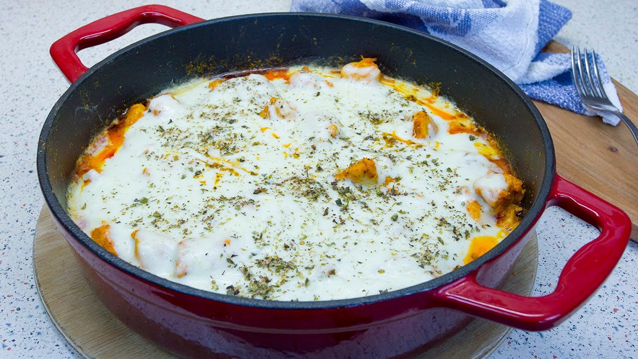 صدور دجاج مقطعة إلى قطع صغيرة، ملح، فلفل أسود مطحون، مسحوق بابريكا، كمون، فلفل حريف، ثوم مهروس، معجون طماطم، زبادي، نتركها في التتبيلة لمدة ساعة على الأقل (في الثلاجة)، زيت، ونقلي الدجاج فوقها. نار عالية لمدة 2-3 دقائق، يغطى ويطهى على نار خفيفة حتى ينضج اللحم، يوضع جانبا، زبدة، دقيق، يطهى لمدة دقيقتين، حليب، أوريجانو مجفف، بردقوش مجفف، ملح، فلفل أسود مطحون، يطهى حتى يصبح سميكا، جبن مبشور ، أوريجانو مجفف، يُخبز على حرارة 200 درجة مئوية (390 درجة فهرنهايت) لمدة 10 دقائق