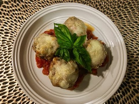 I did not use the mushroom stems in the video, however, you can grind them in a food processor if you choose. Then cook them right with the sausage. Its totally up to you. Season the sausage with salt and pepper. Remove to a large bowl after it has browned and is completely cooked through. If you find there is an excess of sausage grease, definitely drain. Add the marinara, Mozzarella and eggs. It is best to use your hands to mix this with because the sausage may still be in “clumps”. You can wear plastic gloves if you desire. Once it is mixed well, taste it for additional salt and pepper. You can also add more pesto or basil if you so desire. Now add the breadcrumbs and mix in well. Take a tablespoon or so in one hand and squeeze it together. This helps it to bind together. Hold the cap in one hand and place the stuffing on top. It should mound up fairly high. Follow the video if you are uncertain. Top with Mozzarella and/or Parmesan. You can use any oven proof pan to bake them in. Either coat the pan with a little olive oil or marinara sauce.