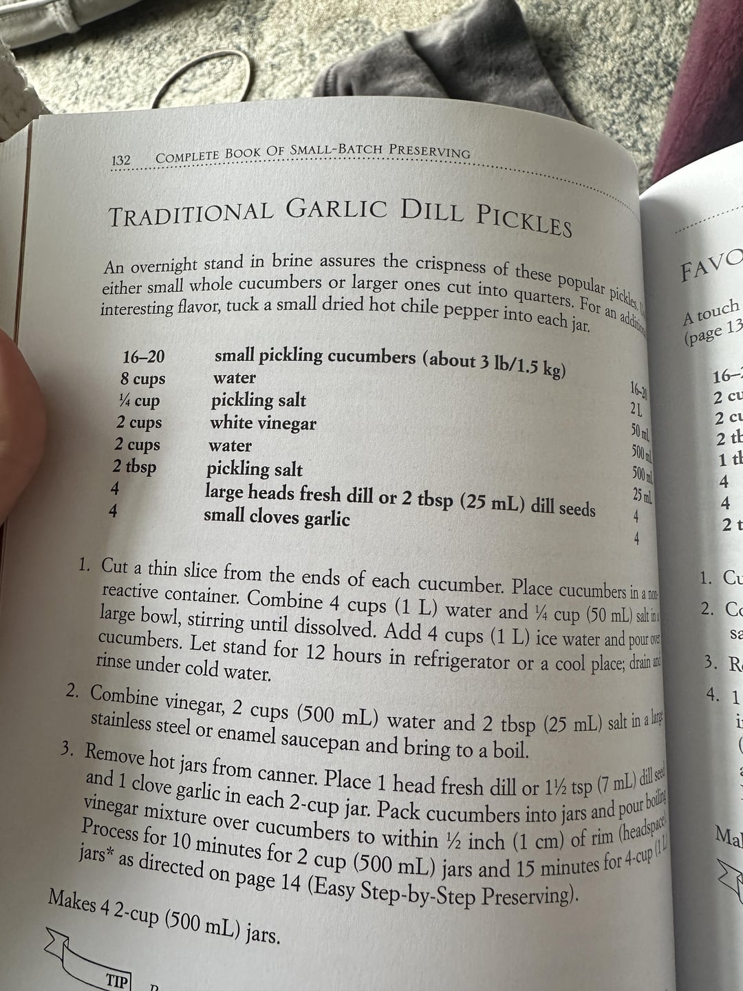 We made a batch of pickles from the Small-Batch book ( but didn’t have large fresh dill heads that it calls for so I thought maybe we could use 1tbsp of finely chopped dill weed per jar similar to the recipe in the Bernardin book (Grandma’s Dill Pickles) as well as add a tsp of mustard seed. I calculated and it seems that the recipes are pretty similar ratios –