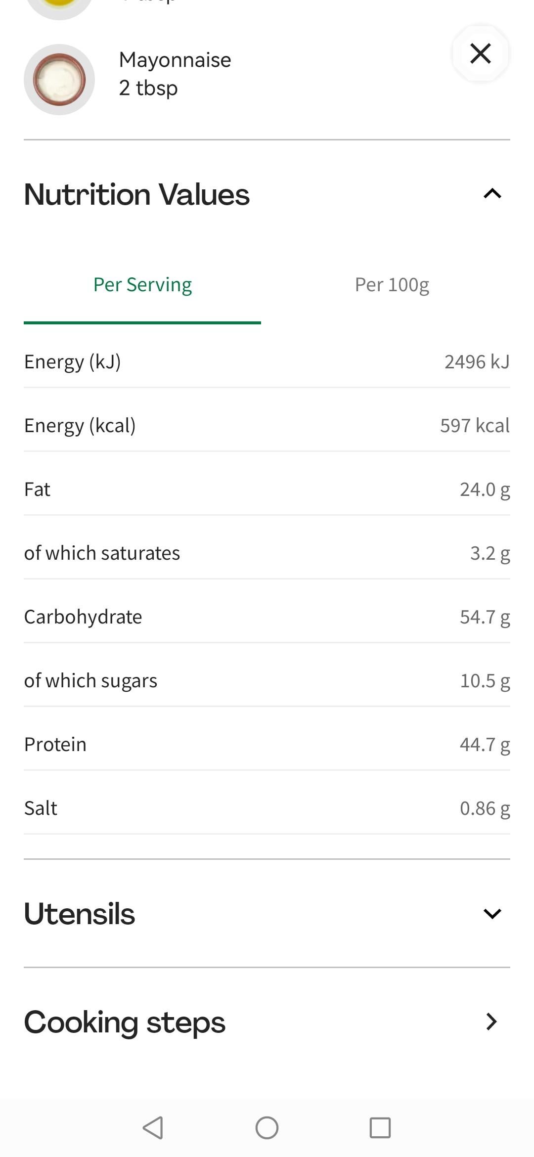 The only high protein source in this one is two chicken breasts for 2 meals (240g which is about 56g of protein). Yet it says that per serving it has 44.7g of protein….