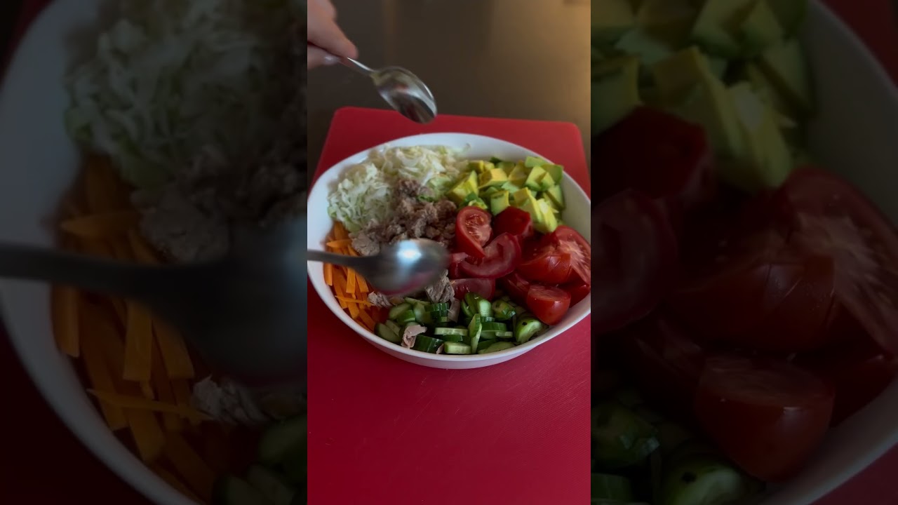 Я просто обожаю салаты потому что не нужно никакого рецепта осталась морковь на струга морковь Тут даже остатки капусты огурец и помидор есть вообще в каждом доме почему бы их не использовать авокадо у нас в этом году просто сумасшедшие У меня просто холодильник ими забит и кстати в каждом израильском доме обязательно есть баночка тунца и тунец пойдёт туда же самый банальный соус это масло смесь Соли и перца Ну и конечно же побольше лимона всё перемешали Я сегодня улетаю поэтому часть салата я переложная варёные и соус конечно же В отдельной коробочке но остальное заправляем соусом и приятного аппетита