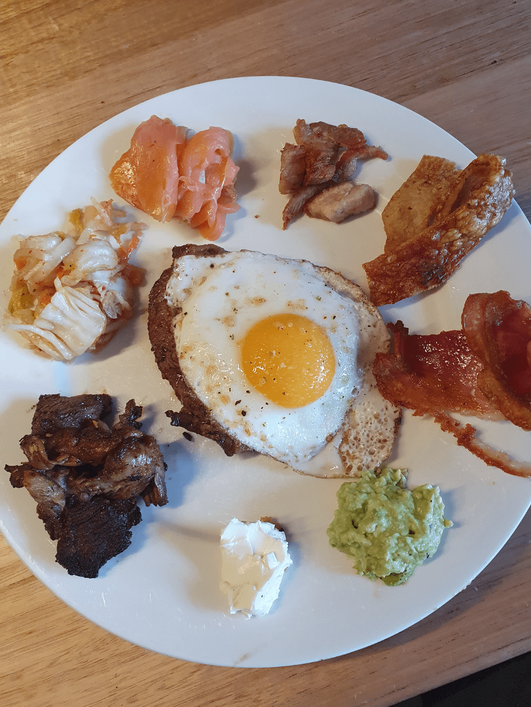 Smoked Salmon with Cream Cheese and Gaucc, Crispy Bacon, Pork Crackle, fried pork rib, Lamb roast, Kimchi and a Steak with fried egg.by No-Acanthisitta404 Write A CommentYou must be logged in to post a comment.