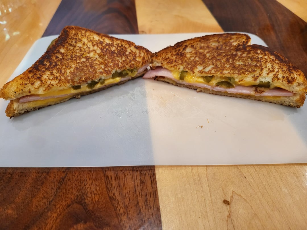 So I had this idea to add sliced pickled jalapeños to my grilled ham and cheese. And it tastes like Chedder cheese Jalapeño poppers and the slice of ham gave me a "baconish" vibe.