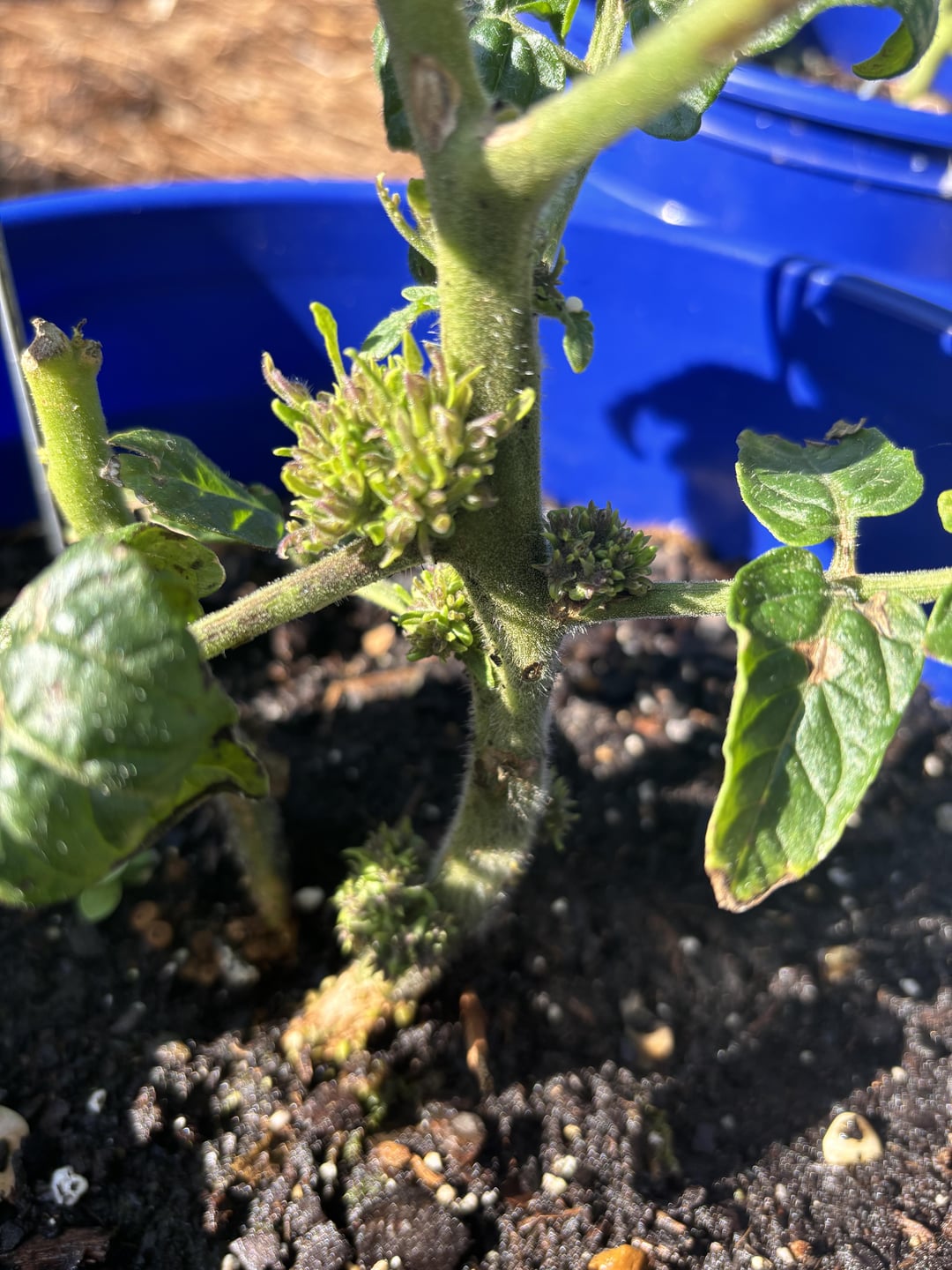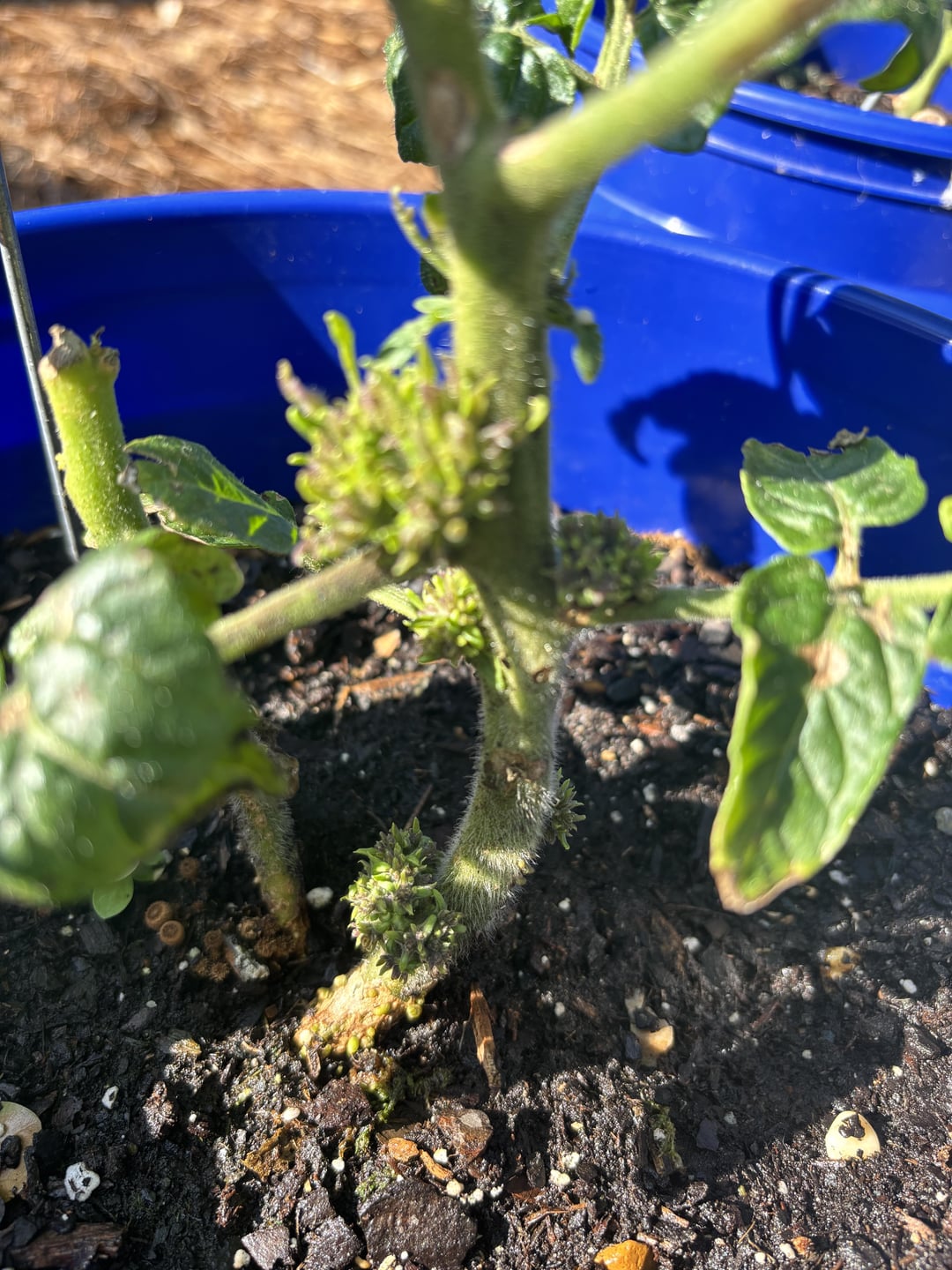 Been trying a number of different tomatoes and growing options over the last few years to learn what works best for our set up, being in Southern Alabama heat. Been successful. This year I may have topped this tomato plant a little too severely. The top that was cut has turned into a beautiful new plant. But the “source” plant has refused to grow or flower. But has started producing these strange clusters, pictured.
