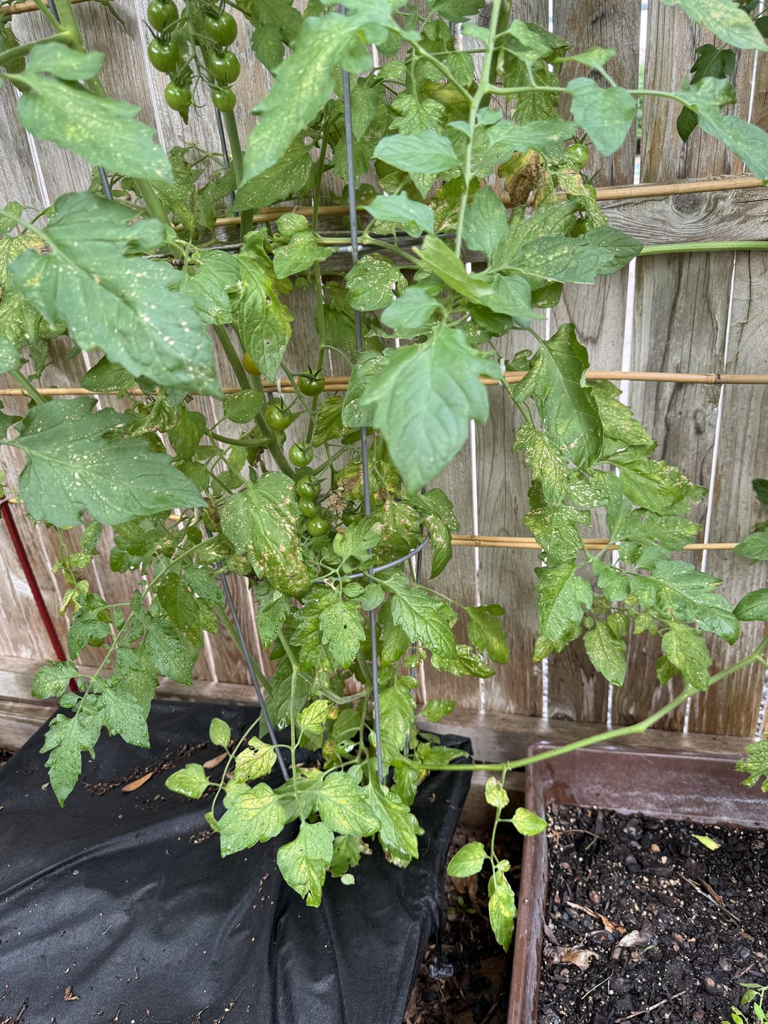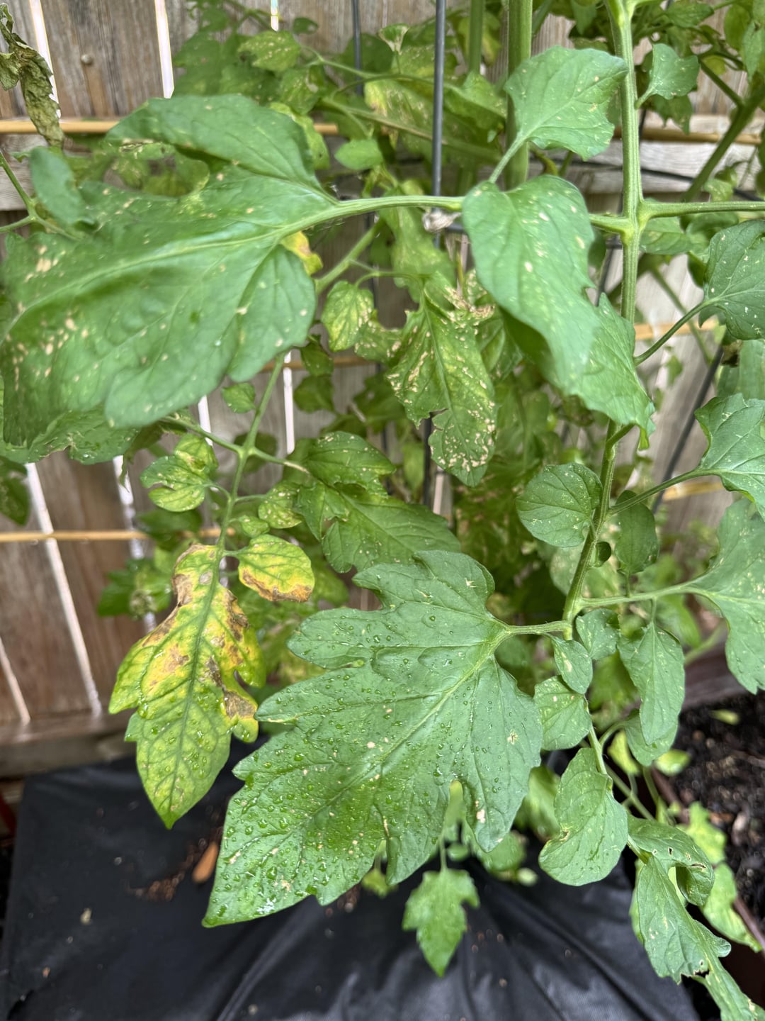 I grow it in an earth box. The tomatoes look fine, it’s just the leaves. They get these small speckles of light tan colored dots and then get worse from there, turning yellow and crispy brown. It seems like it mostly effects the older leaves. They get west sun, could it be sun scorch? Or is it something nutritional or a disease?