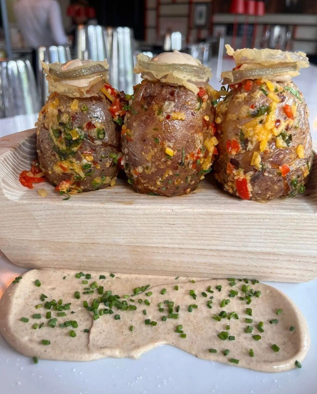 “Couch Potatoes” – what appears to be a loaded baker served on a wooden “couch”, pinewood derby style.