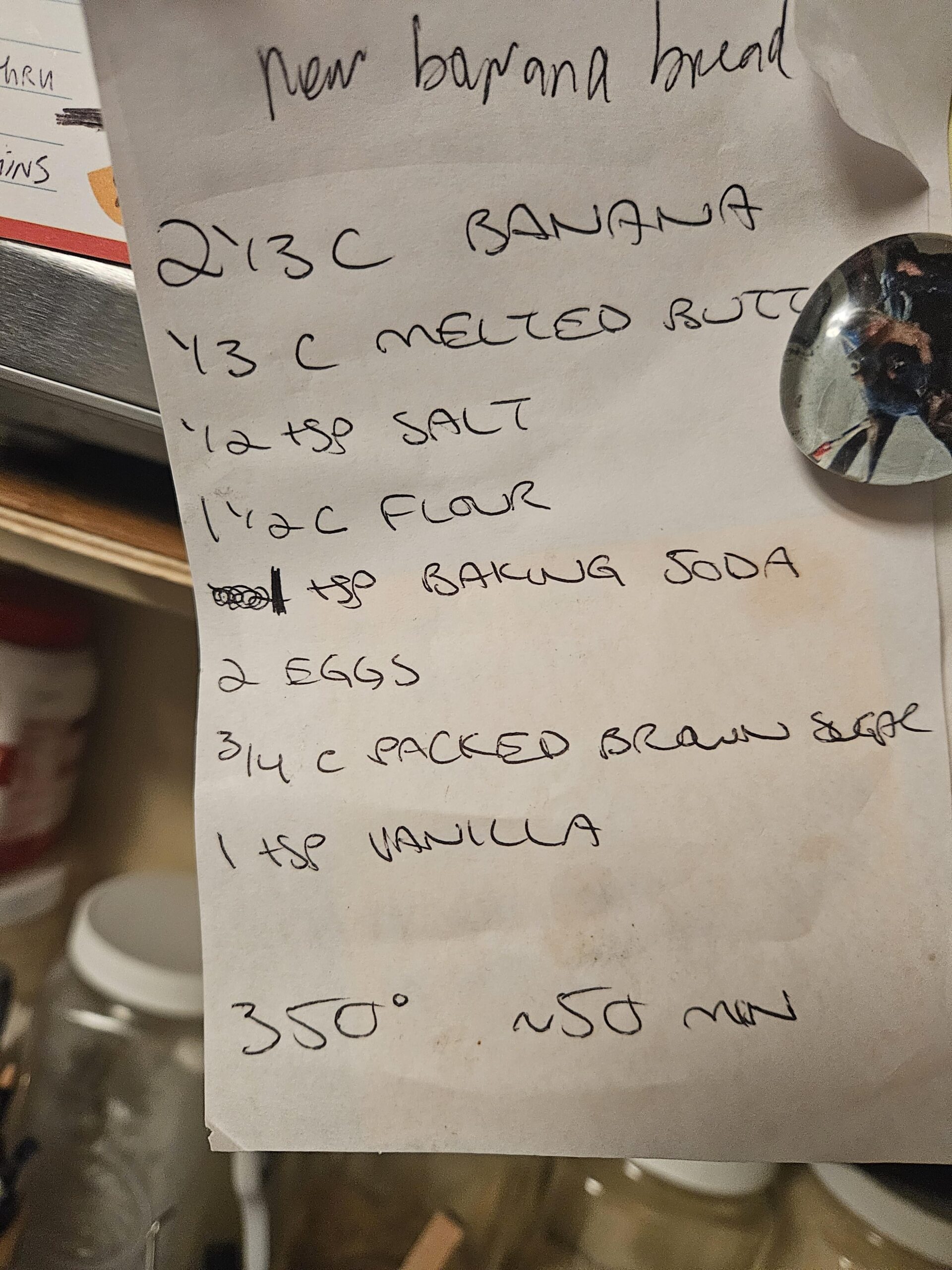 1 loaf 3 bananas, a little buttermilk, more flour and sugar, 320, 1hr 20min