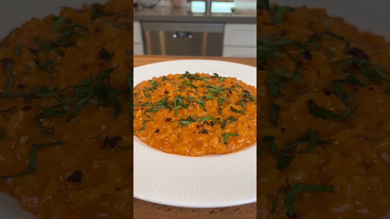 vodka sauce risoto everyone’s obsessed with spicy vodka pasta so let’s make some vodka sauce risoto start by sautéing enough garlic and red chili to kill a Brit let that cook for a few minutes then pour in some arboro rice toast it squeeze in a whole bunch of tomato paste then combine everything and now for the star of our show some vodka imported Straight From Italy light it up give it a few tosses then you’re ready to Ladle in some hot chicken stock don’t forget the salt and pepper and be patient cuz you’re going to be stirring for a bit on the bright side this is the second best forarm workout I can think of after about 20 minutes of going at it it’s time for your cream stir that up cut the heat then toss in a bunch of cold butter next we’re going to add in some of the Undisputed king of cheeses pecino Romano once everything’s combined you’re ready to Plate it up top with some more red chili flakes and fresh basil and it’s time to dig in once you try this you’ll never make risotto any other way again