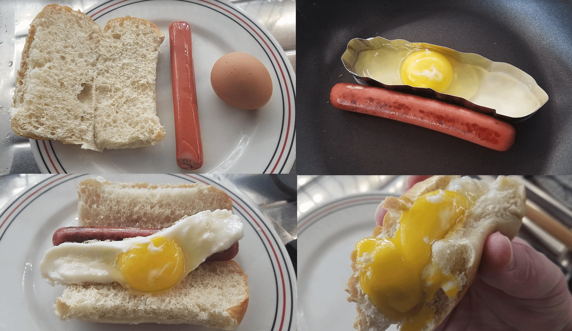 z7q2 2 years ago I wanted to make an oblong egg for a hot dog bun, and mangled an old cookie cutter into the proper shape.Yes, I should have buttered and toasted the bun. The science took precedence.
