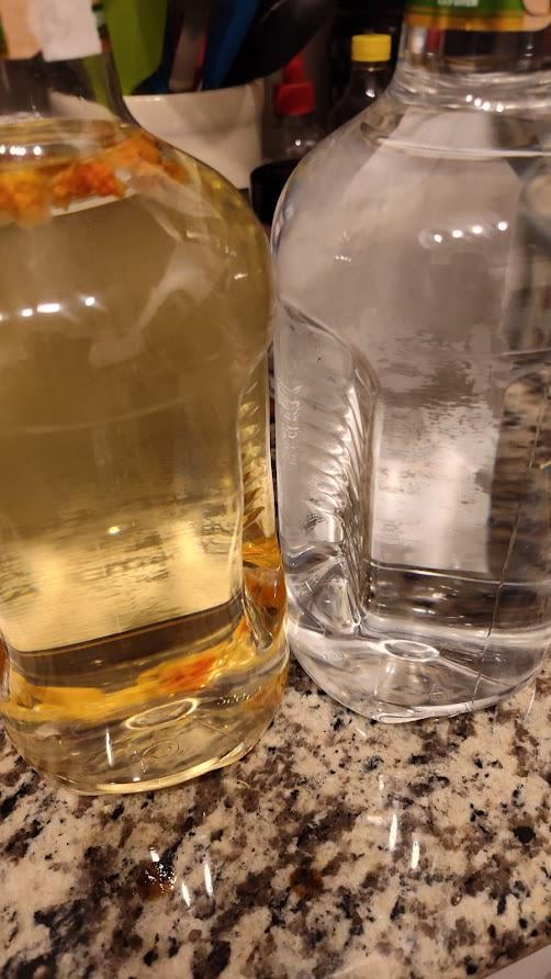 I made scorpion pepper infused vodka, just a couple small dehydrated ones left for 6 weeks. Wow, it’s way hotter than the slight discoloration would suggest! (regular vodka for color contrast)