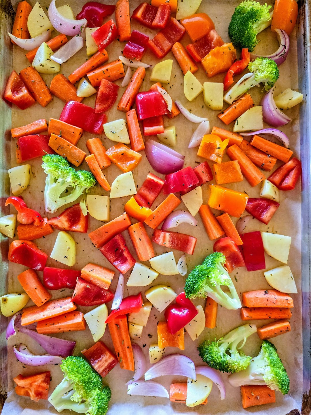 Here's a fun way to use up leftover vegetables: roast them all together! I raided my fridge in advance of my weekly shopping and came up with a colorful mix of potatoes, carrots, red onion, bell peppers, and broccoli. To ensure even cooking, roast vegetables in stages based on their cooking times. Start with denser vegetables like potatoes carrots and onions, then add quicker-cooking ones like peppers and broccoli later. Also, make sure you cut them in similarly sized pieces.