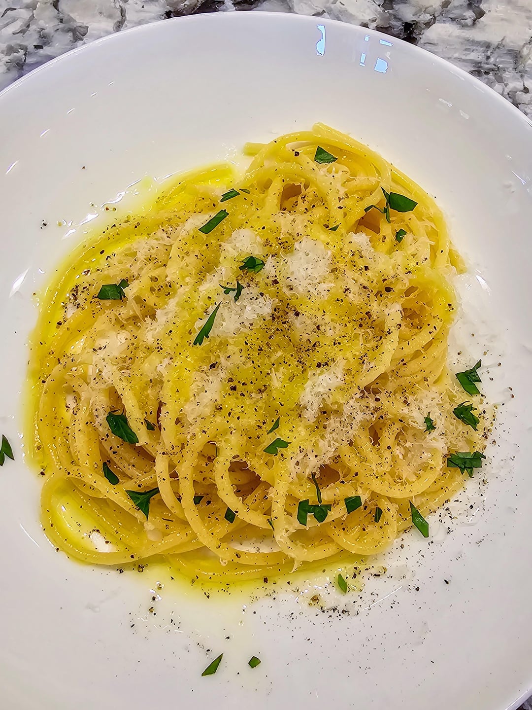 With that, I made the easiest pasta ever: once cooked and drained, I simply add a big drizzle of olive oil, some grated Parmigiano Reggiano and lots of pepper.