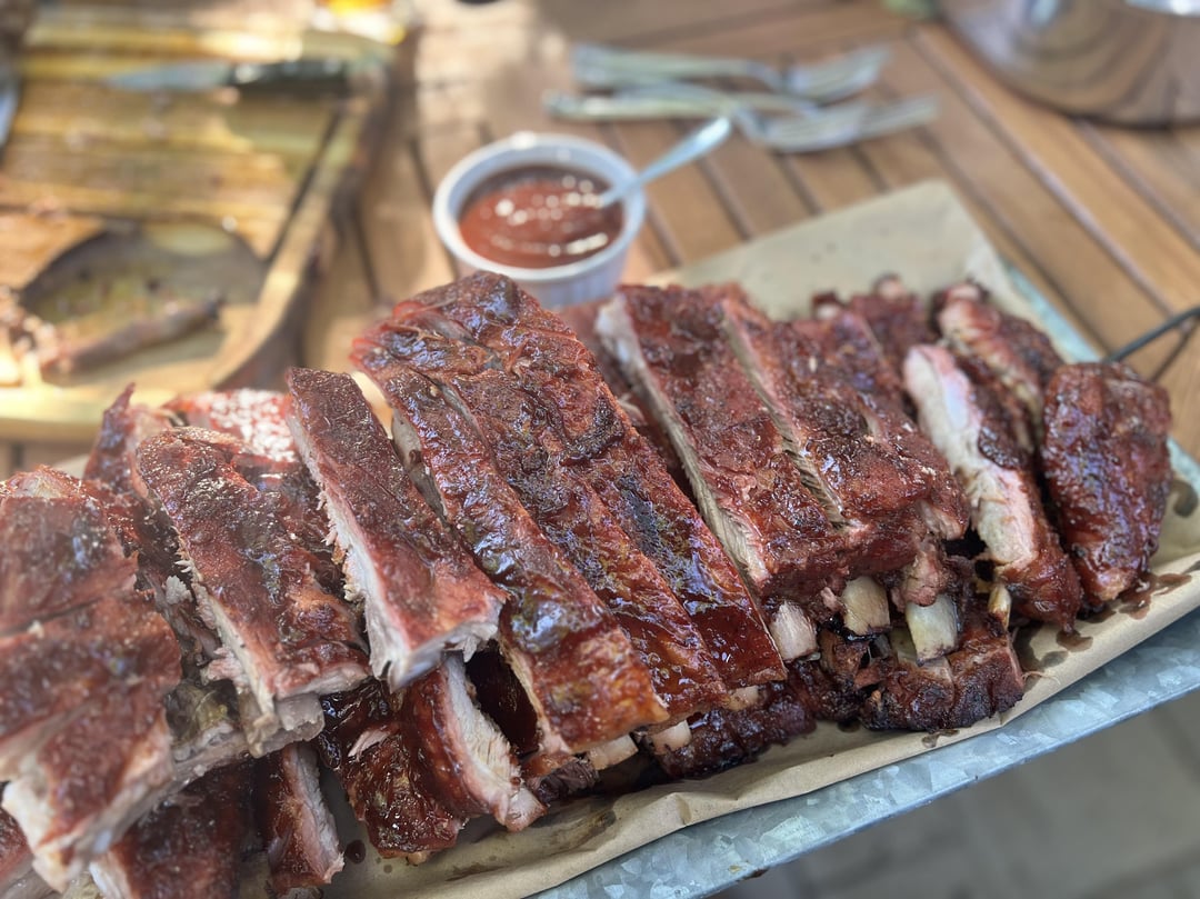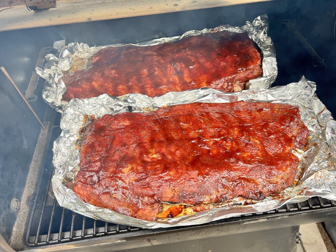 Got a BOGO deal on a rack of ribs, so here we are! First time on the Traeger. Started at 275° for 90min, but it got up to temp way faster than I expected so I cranked down the heat for another hour or so and then let it stay warm 180° until we ate. It came out amazing! Roughly followed the Meat Church bourbon bbq recipe.