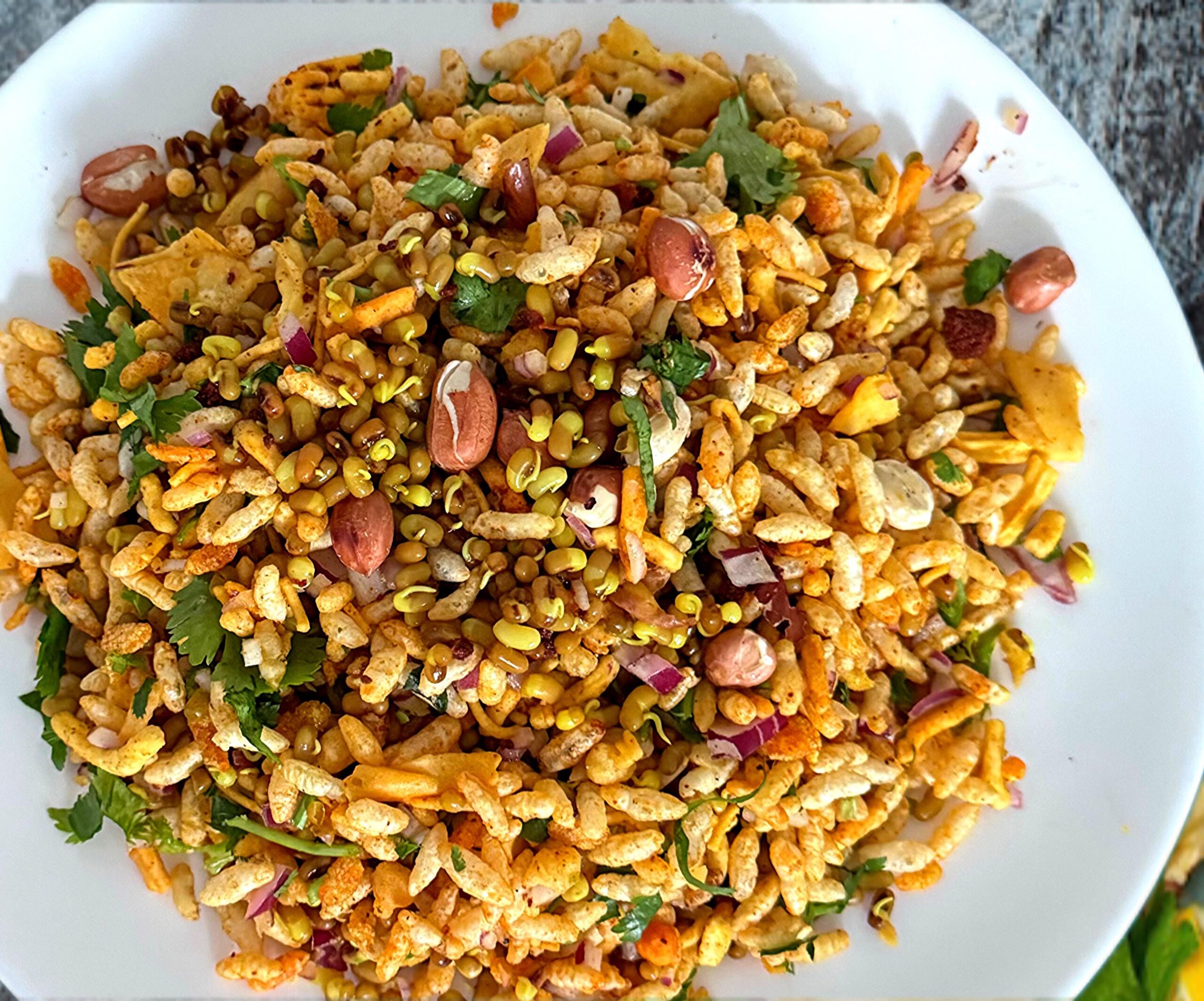 – 1 cup Sprouts (Moth Beans) – 2 cup Farsan/Namkeen – 3-4 cup Murmura/Puffed Rice – 4-5 tbsp Lemon Juice – 1 small Onion, finely chopped – 3-4 Indian Green Chilies, finely chopped – 1/2 tsp Turmeric Powder – 1 tsp Red Chili Powder – Salt, to taste – Chaat masala – 1 tbsp – Onion garlic masala (kanda lasun masala) – 1 tbsp – Chopped Coriander Leaves, for garnish – Salted Peanuts, for garnish