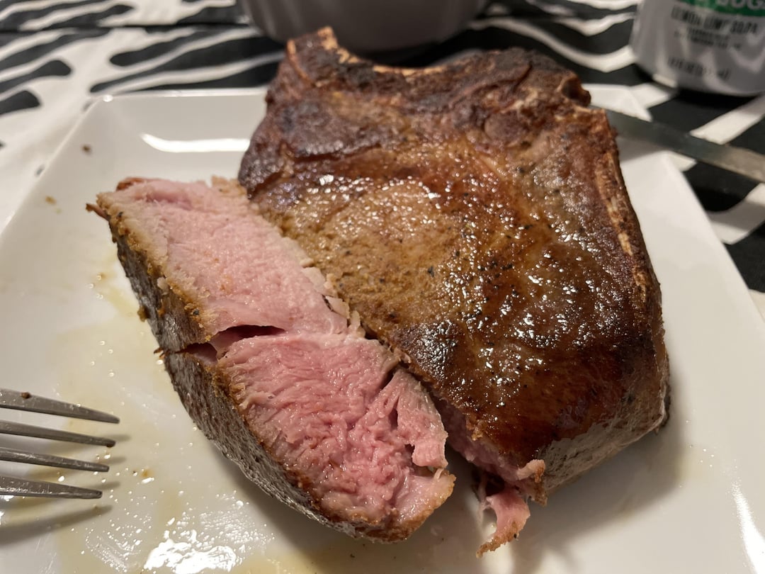 137 for around 3 hours. Cool water bath, pat dry, then seared in cast iron about a minute per side. Pink and juicier than it looks in the photo. Served with a mountain of broccoli and cheese sauce because keto.