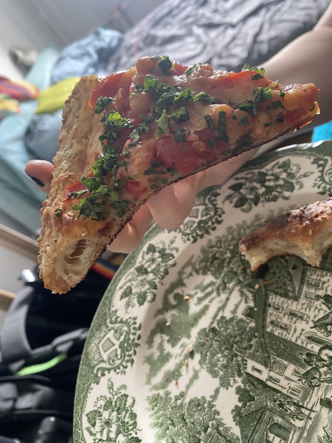 Filled it with string cheese and put on plain tomato sauce. Topped with mozzarella, cherry tomatoes, red peppers, leftover baked beans and a mix of parsley and coriander.
