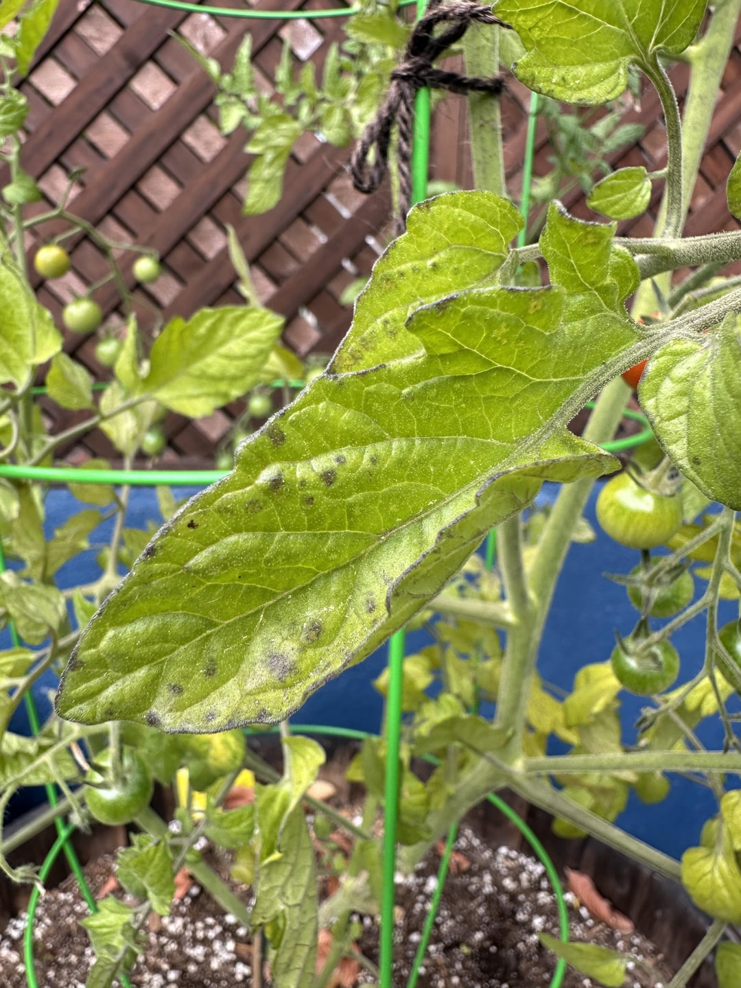 Hi there! I just noticed today that my sungold tomato plant has all these dark spots developing on its leaves, all across the plant (even on some of the younger leaves). These seem to have almost appeared overnight, which is worrying me!