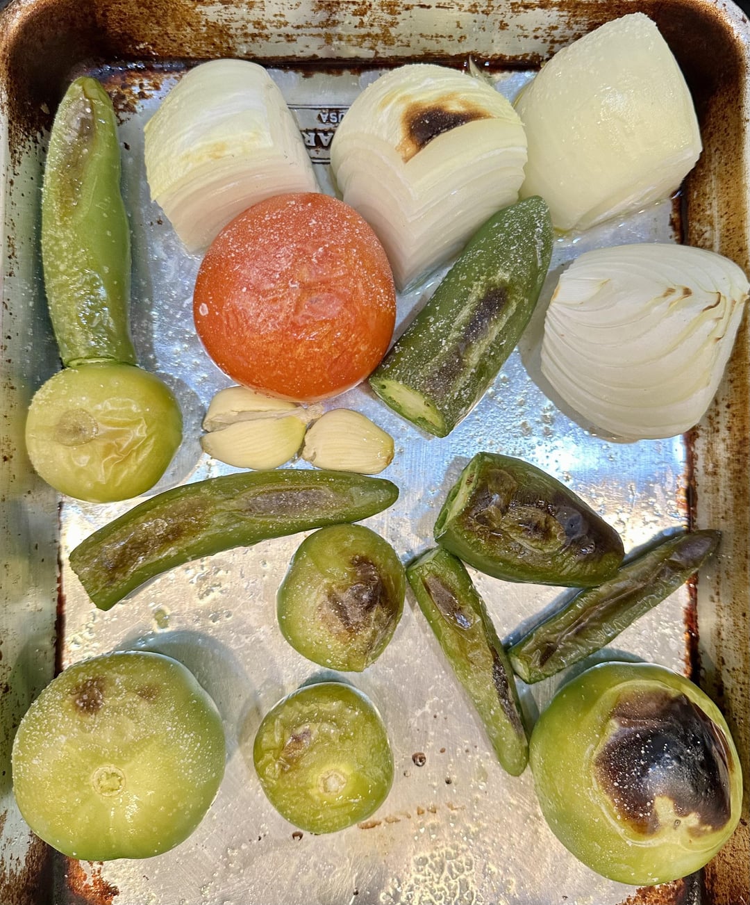 Roast serranos, jalapeños, onion, tomatillos and garlic