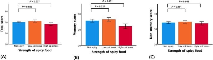 “Subgroup analyses showed that the association between a high level of spiciness in food and a lower memory ( − 0.254, p < 0.001) and global score ( − 0.222, p = 0.002) was present only in older adults with low physical activity, but not in older adults with high physical activity.”