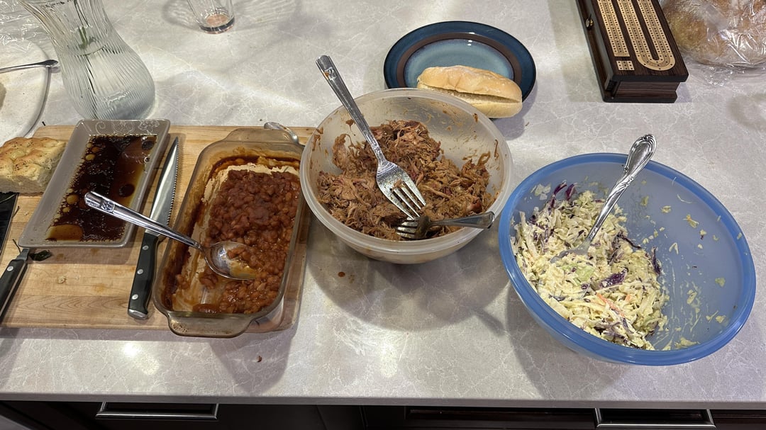 10 hr at 225°f, with bbq baked beans smoked for 7 hrs and Cole slaw. My personal fave with the Guinness Bullseye.