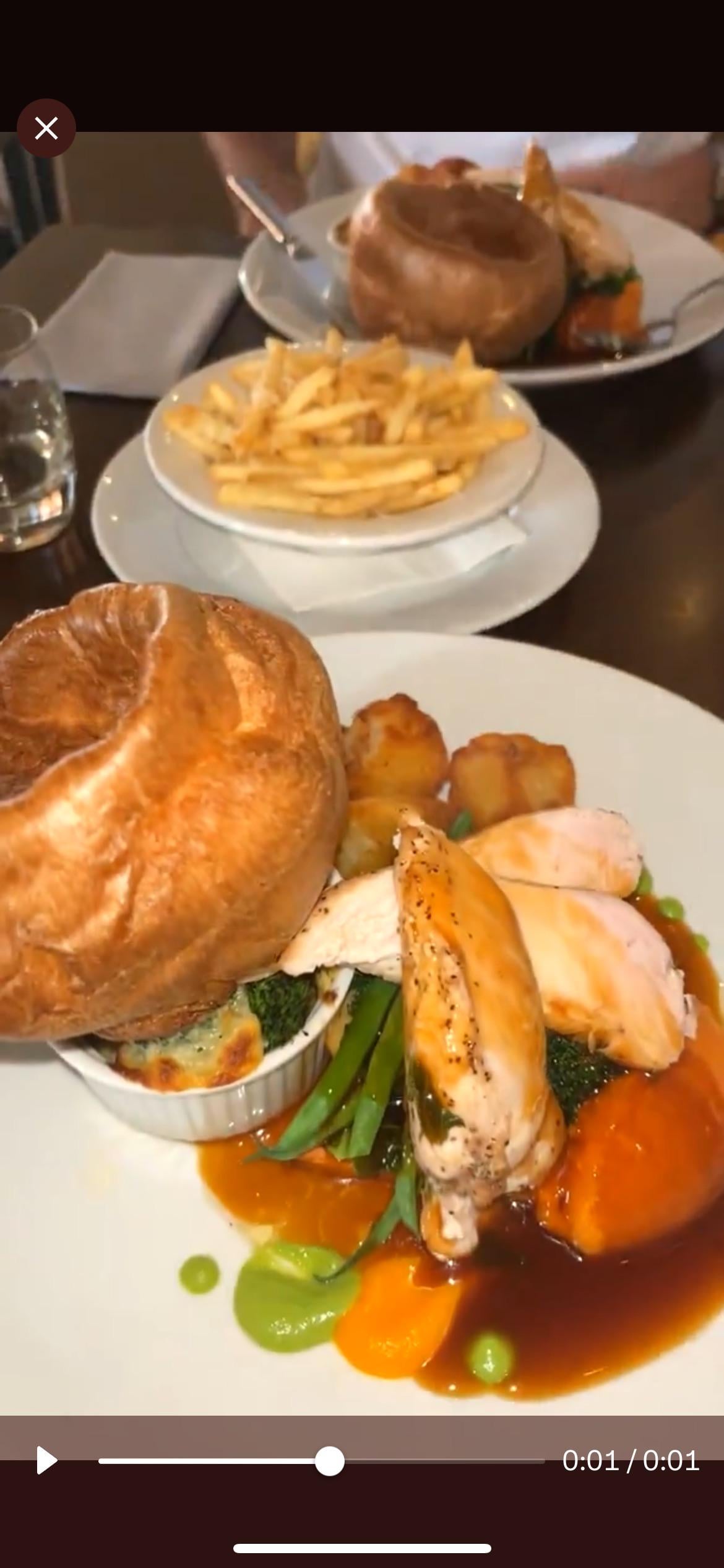 Chicken fillet with Yorkshire puddings and fries, and sauce with some veg