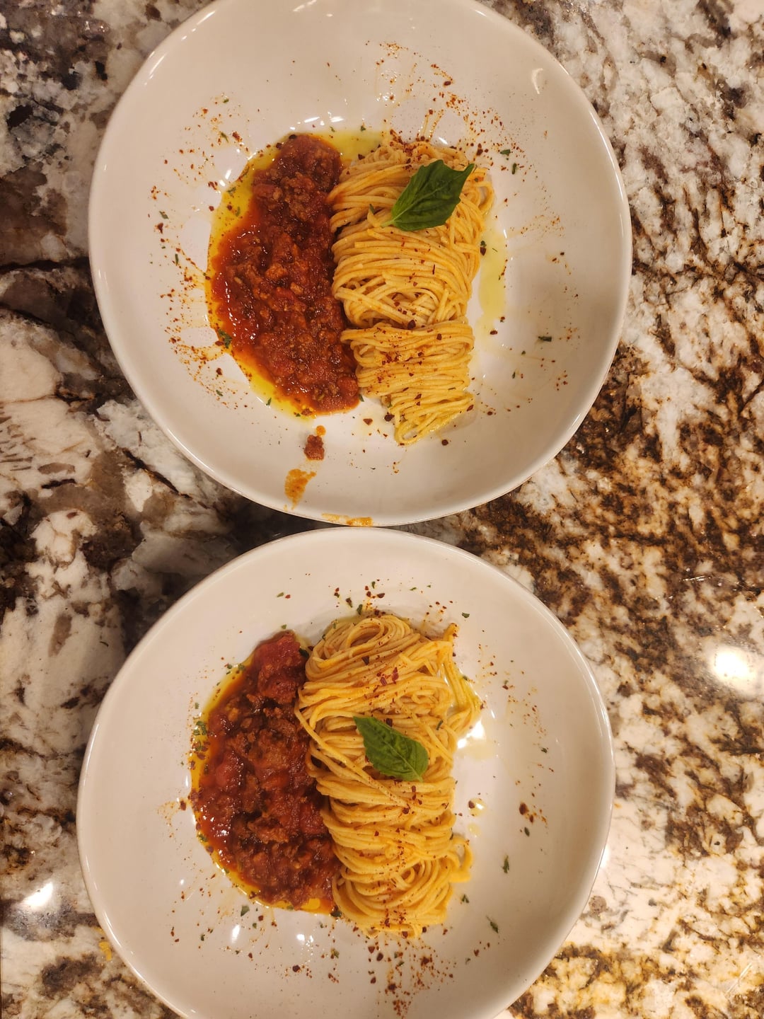You can call it something like Rich Tomato Meat Sauce, I like it, I think the plating would work a tad better if the pasta was partially covered. I’d be wanting more sauce and it does look good, the leaf is also super out of place.