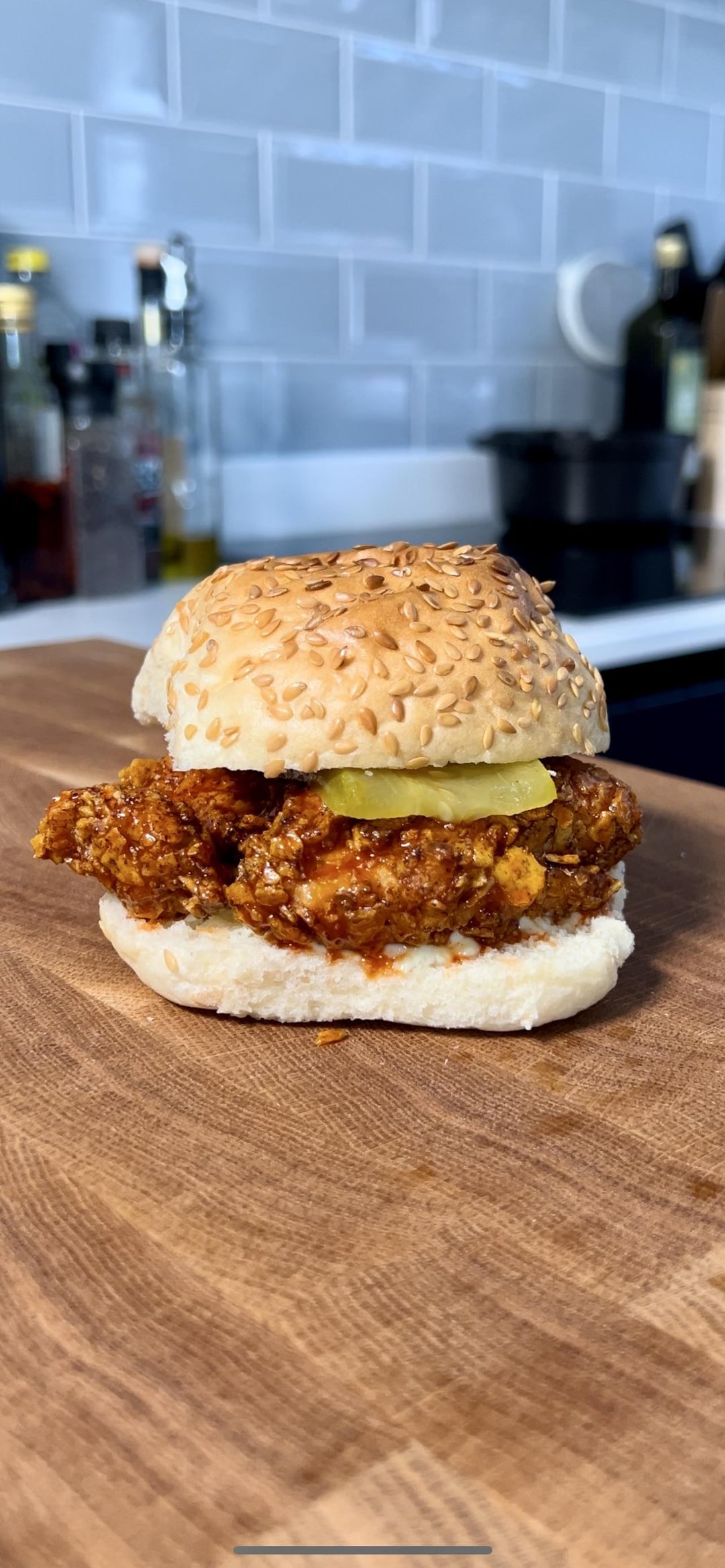 I thought this was a great idea but turned out just ok. Pretty simple substitute of breadcrumbs for crushed Doritos. I the covered in a honey gochujang sauce which was really nice!