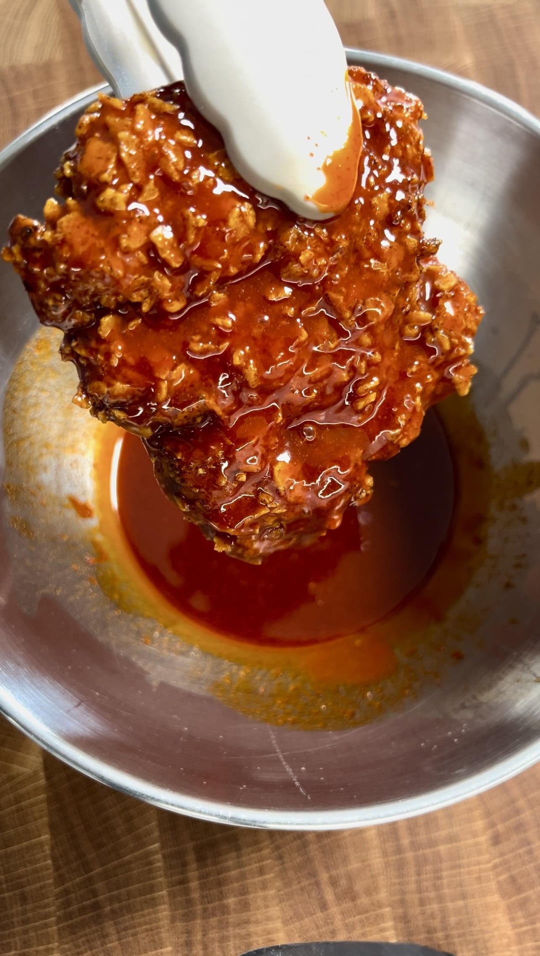 My dad used to do a similar thing when frying chicken. He would crush up bbq potato chips and mix that into the batter, then would brush some bbq sauce on it. It was super yummy