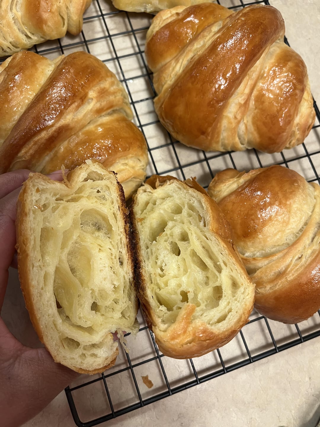 Hi guys! I’m an intermediate baker and decided to make croissants for the very first time. I used Claire Saffitz NYT recipe. The recipe was easy to follow but definitely required a lot of technique. I cracked my butter by time I got to the second fold but decided to just keep pushing through. I also struggled with rolling my dough thin enough. Any tips on this? Any tips on my next bake? My butter bill is about to be crazy this month lol.