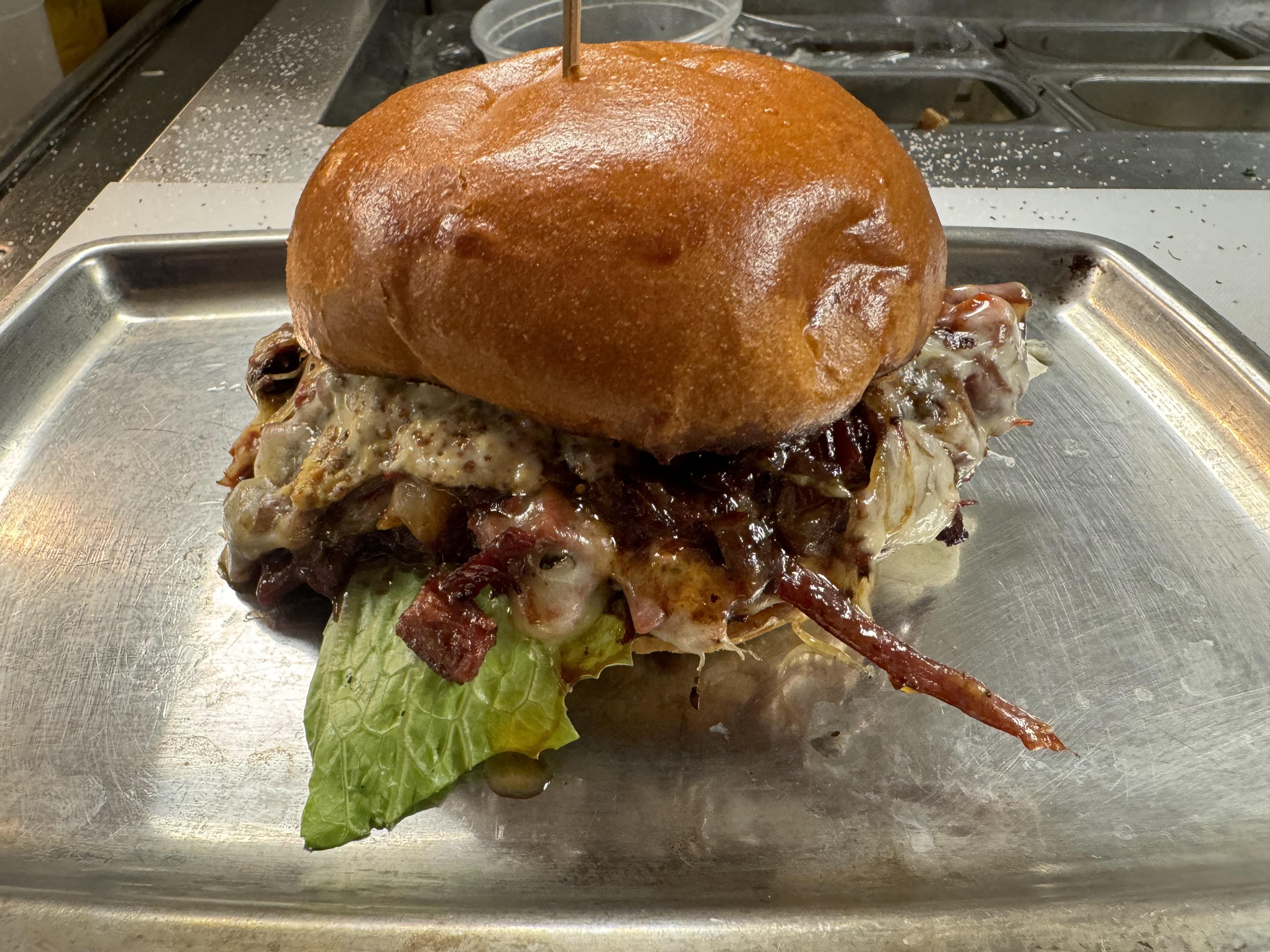 Pastrami I made myself, Truffle mustard mayo, Demi glace, Provolone, Lettuce and onion, on a toasted roll