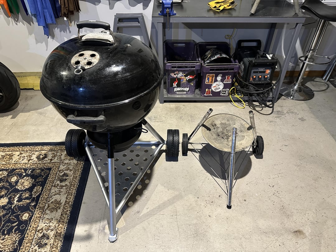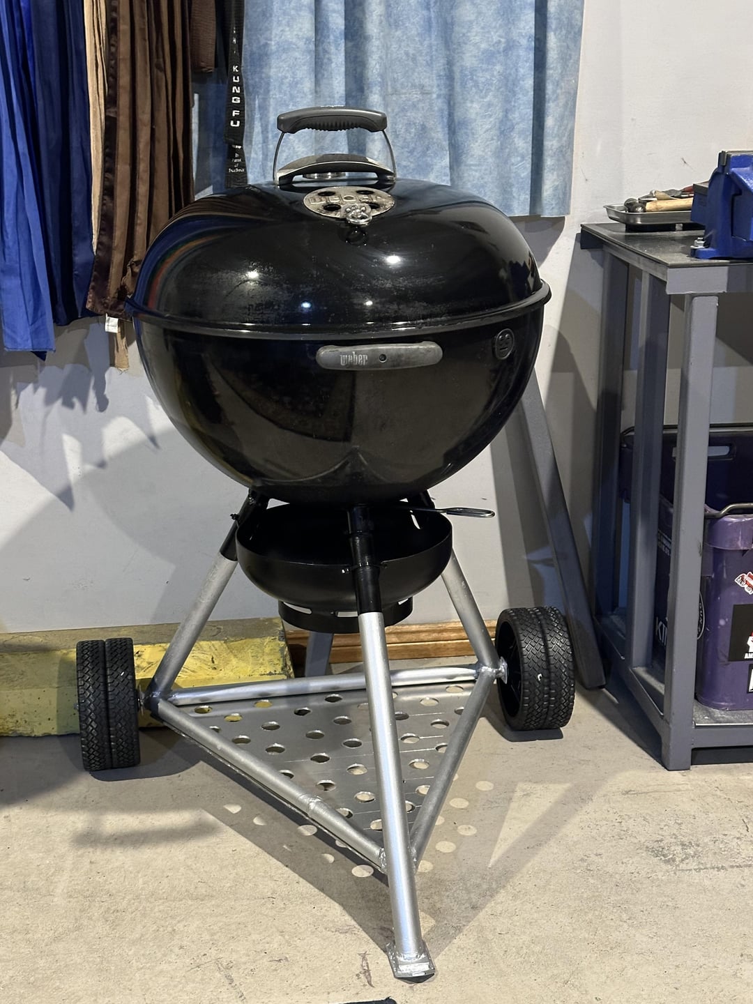 Fully welded oversized gal tube frame with alloy bottom shelf and a 4” lift, oversize dual wheels on floating axle, 1/2 LPG bottle ash catcher and added probe port. Original frame for comparison.