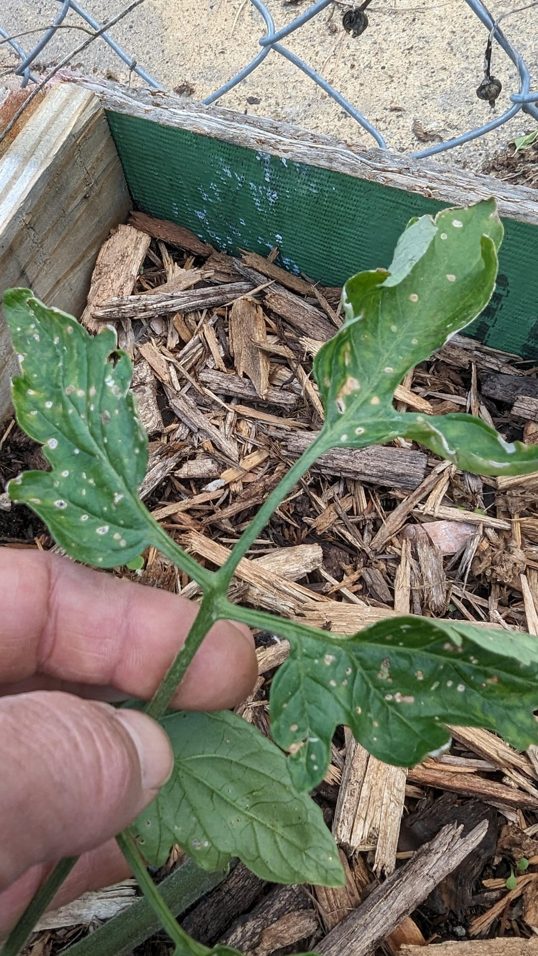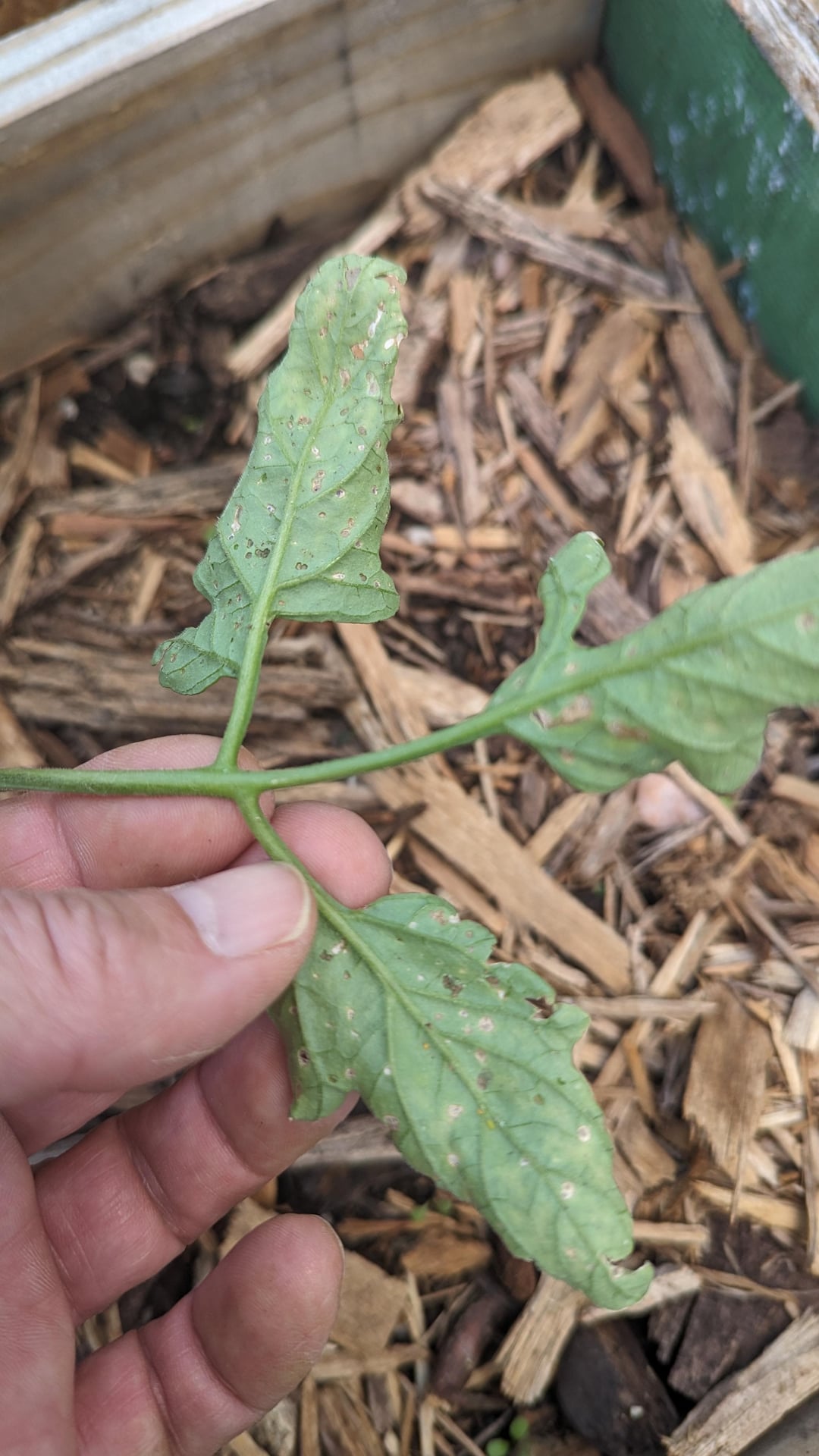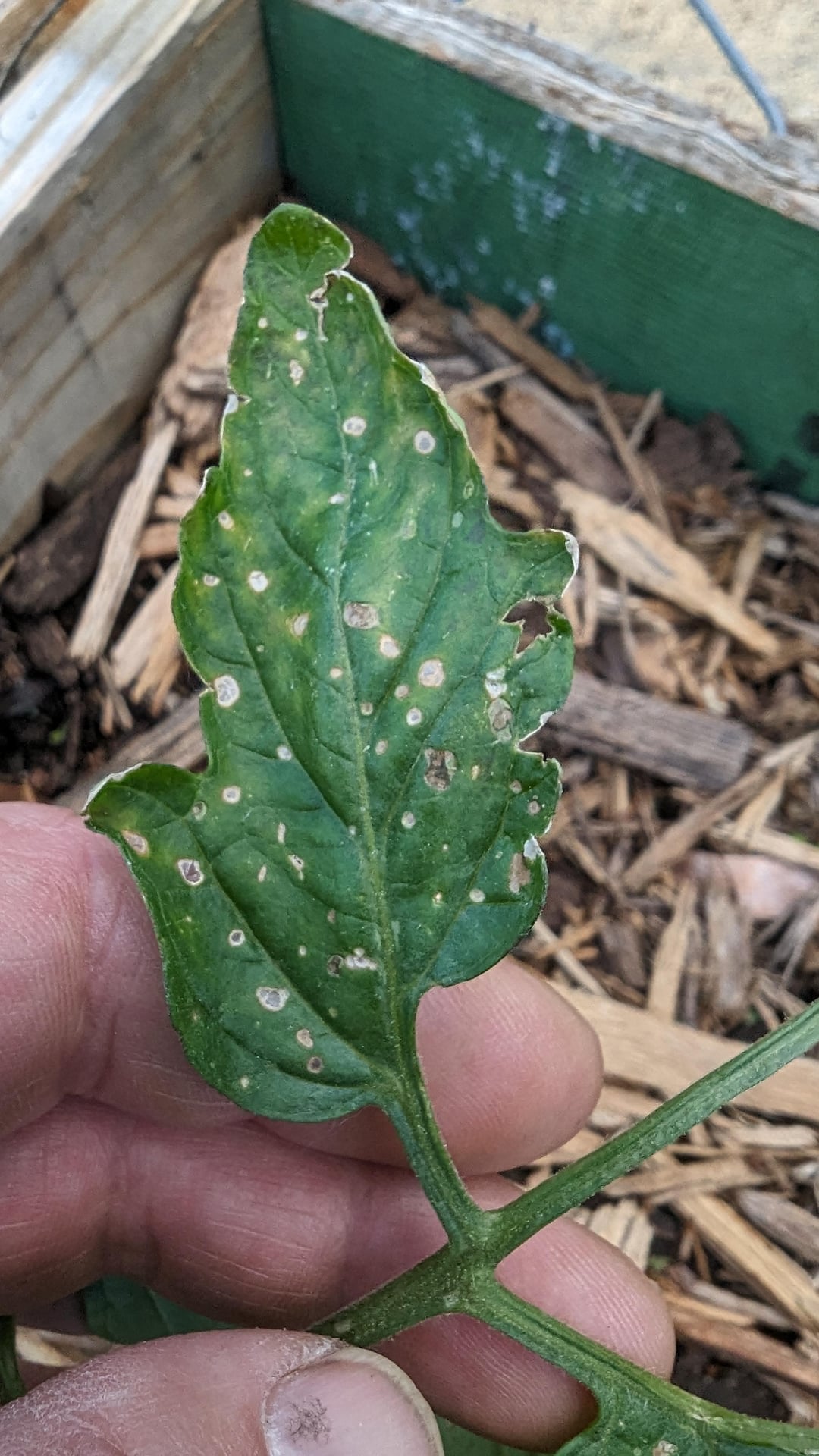 I don’t believe you have any disease going on here. Those are flea beetle nips. Flea beetles are tiny, shiny black beetles the size of small ants. You might see one on the leaves if you look very closely in the morning while it’s cool. They are hard to see at all. If you disturb one it will likely jump out of sight. Thus the ‘flea’ part of their name. You have good mulch, and that’s the best prevention. I have wood chip mulch too and I still get them, but they will be worse without the mulch. They will not do significant damage. They’ll only bother the lower leaves. Prune them off when they die, but there’s no rush. Here’s a pic of flea beetle damage to a tomato leaf from my local university extension office: