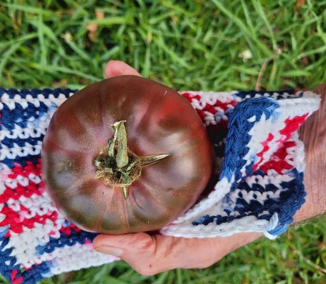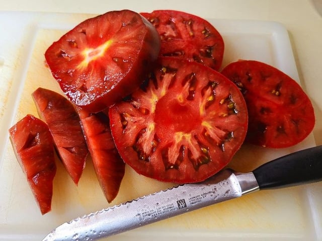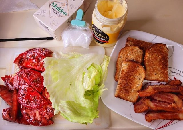 Pluck a couple of ripe dark tomatoes, a Cherokee Carbon and a Black Krim. Thick slices. Cook some slab bacon in my cast-iron pan. Crisp lettuce and multi-grain toast. Duke’s Mayo, original, and Maldon sea salt. Perfection! Worth waiting for and working for.