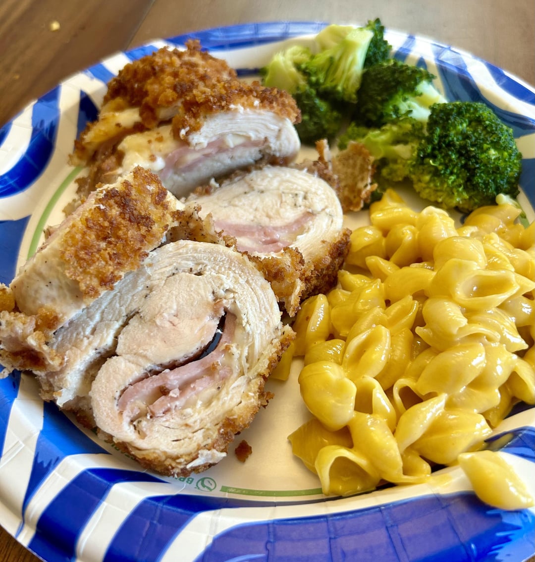Chicken Cordon Bleu with Mac & Cheese and Steamed Broccoli.