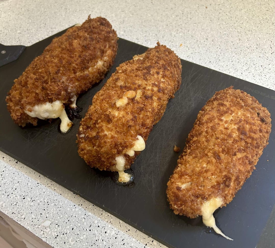 I split chicken breast and hammer thin. Season chicken and roll up with thick sliced ham and swiss cheese inside. Dust the roll in flour. Dip chicken in egg wash before rolling in panko bread crumbs. Let crust set for 10-15 mins then fry to crisp and brown for a few mins each side. 450°F oven after for 15-20 mins to finish. Great reheated in the air fryer the next day.