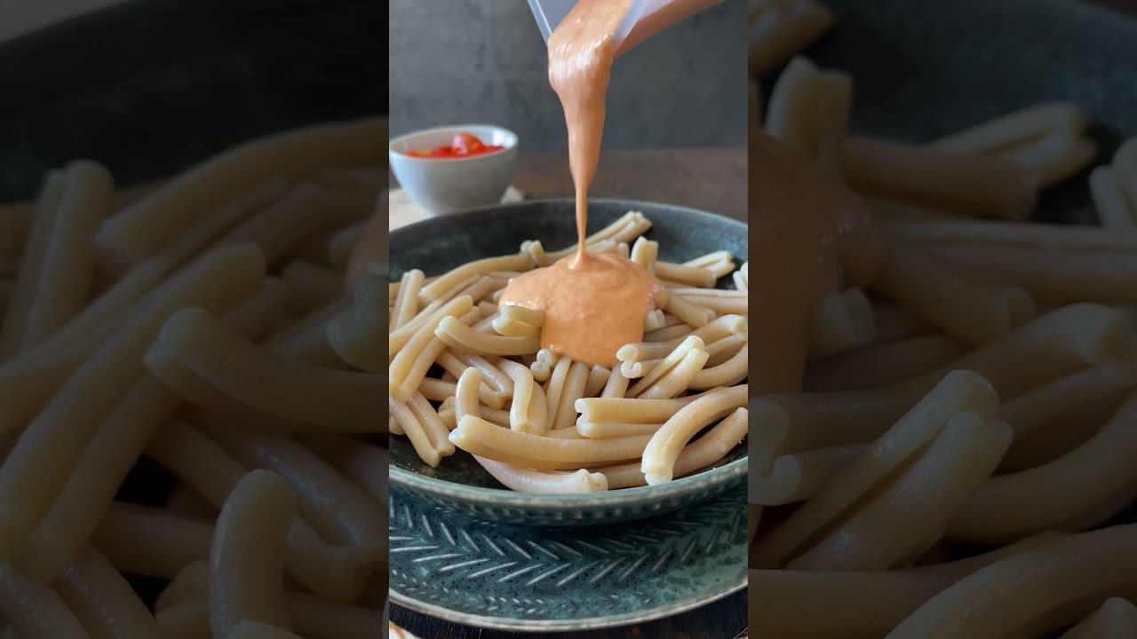 Unire la crema di peperoni alla pasta, mescolare bene, decorare con fiocchi di latte, noci e basilico fresco