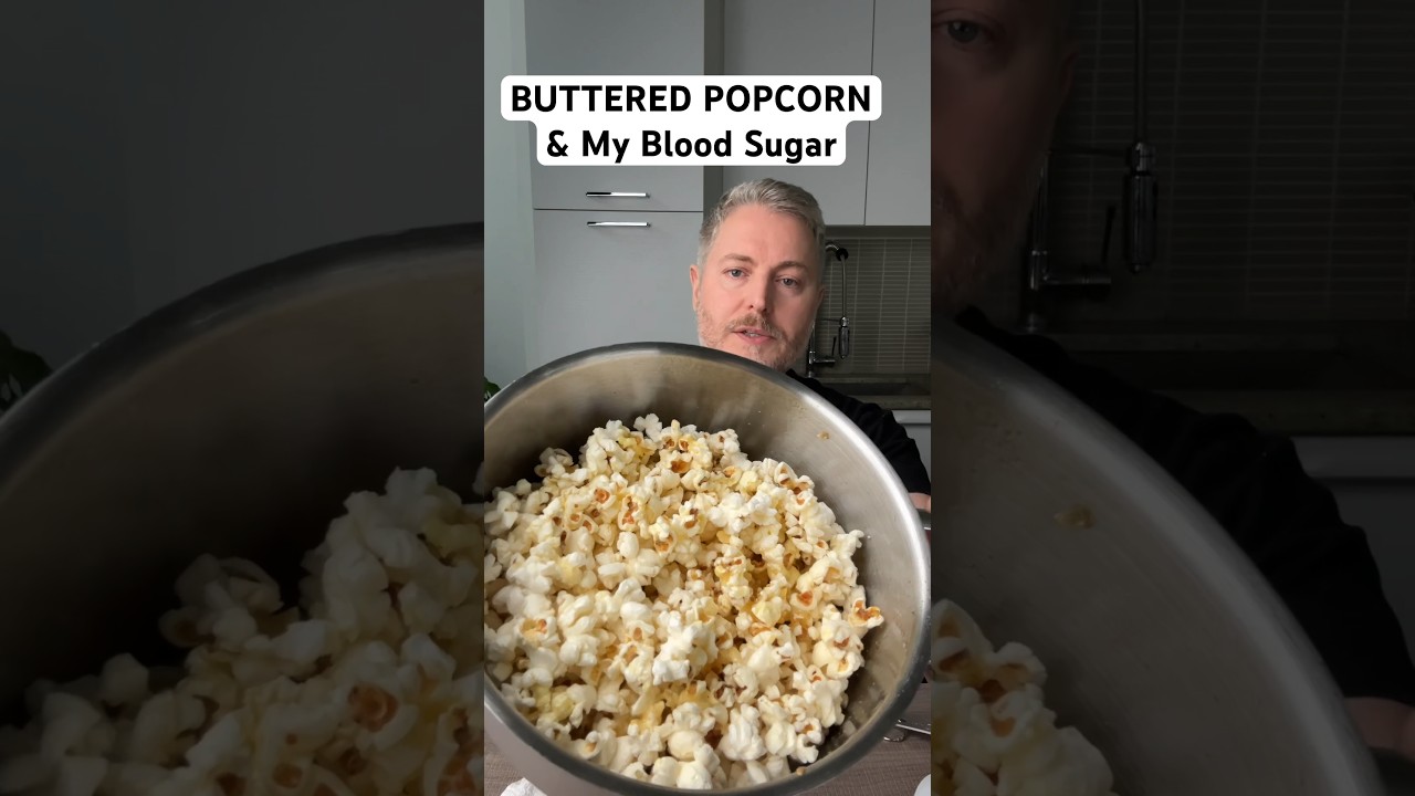 so let’s see what this buttered popcorn does to my blood sugar this is homemade buttered popcorn I started out with 2 tablespoons of avocado oil and 1/3 of a cup of popcorn kernels and of course after it’s popped I’ve added 1/4 cup of melted butter alog together this serving has 920 calories 75 G of fat 6 g of protein 45 G of carbs and 7 G of fiber this is a pretty big carbohydrate load I’m wondering if the fiber in the popcorn and the added fat from the butter will help to slow this down a little bit let’s see what it does to my blood sugar all right it’s been a couple of hours since I’ve had the popcorn let’s have a look at the glucose monitor to see what actually happened here yeah there’s quite a spike here this went up by 39 milligram which is a little higher than I expected especially with all the fat that I put on there with that butter so in the future I may want to reduce the portion size here to help keep those blood sugar levels down I also think there was a little too much fat in there I didn’t
