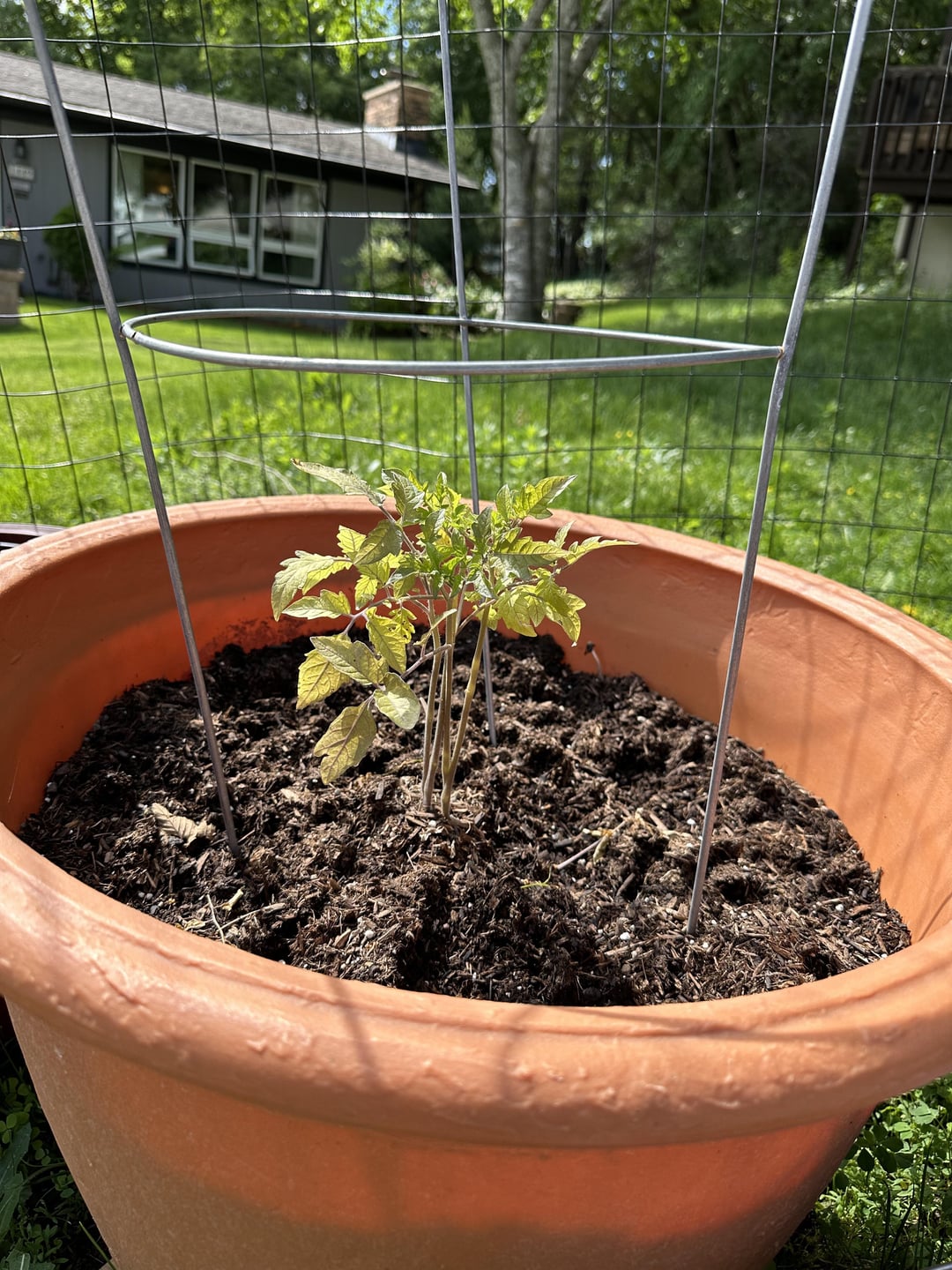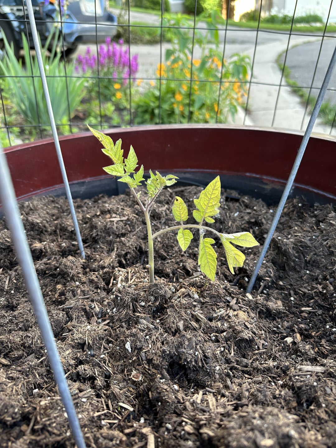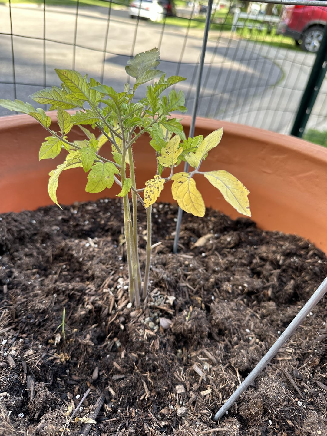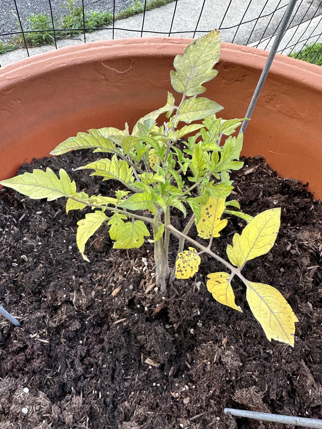 What is wrong with my tomatoes? I have the same varieties growing in containers in my back yard, and they’re doing great. These ones get 6+ hours of full sun per day. We’ve had a LOT of rain recently, so they may be a bit overwatered (but again, the ones in the back yard are doing fine).
