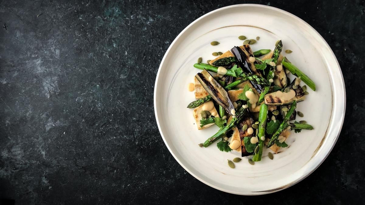 Perfect vegan side salad for Asian inspired meals. Simple yet full of flavour, caramelised eggplant with tofu and asparagus is magically tied together with a luxuriously creamy miso dressing. Full recipe [HERE](https://thesidesmith.com/asian-eggplant-salad/).