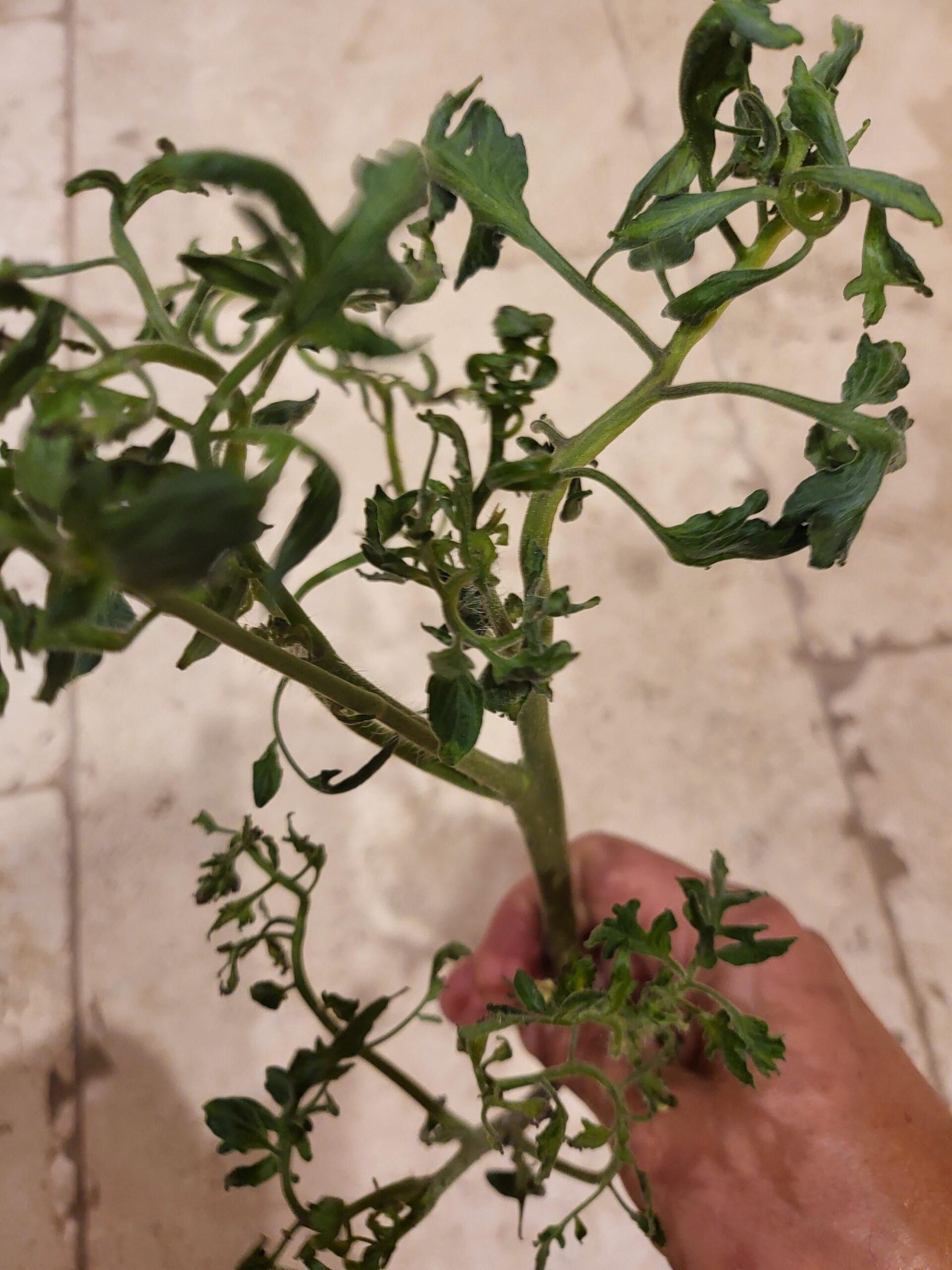 So I had something that looked like this outside this spring and I thought it was the insect spray. The plants were stunted and grew out of it. This is in a greenhouse. It looks at first like the tomato plants are iron deficient with yellowing new leaves. Some of the plant has deformed leaves while other parts are fine. I actually harvested tomatoes that looked fine off the plant. It has now spread around to 4 different types if tomato plants. Any idea what it is?