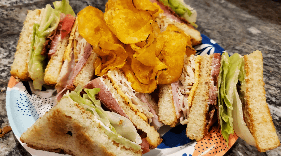 Sliced ham, turkey, American cheese, bacon, lettuce, tomato, with Dukes mayo on toast. Zapps Voodoo chips in the middle.