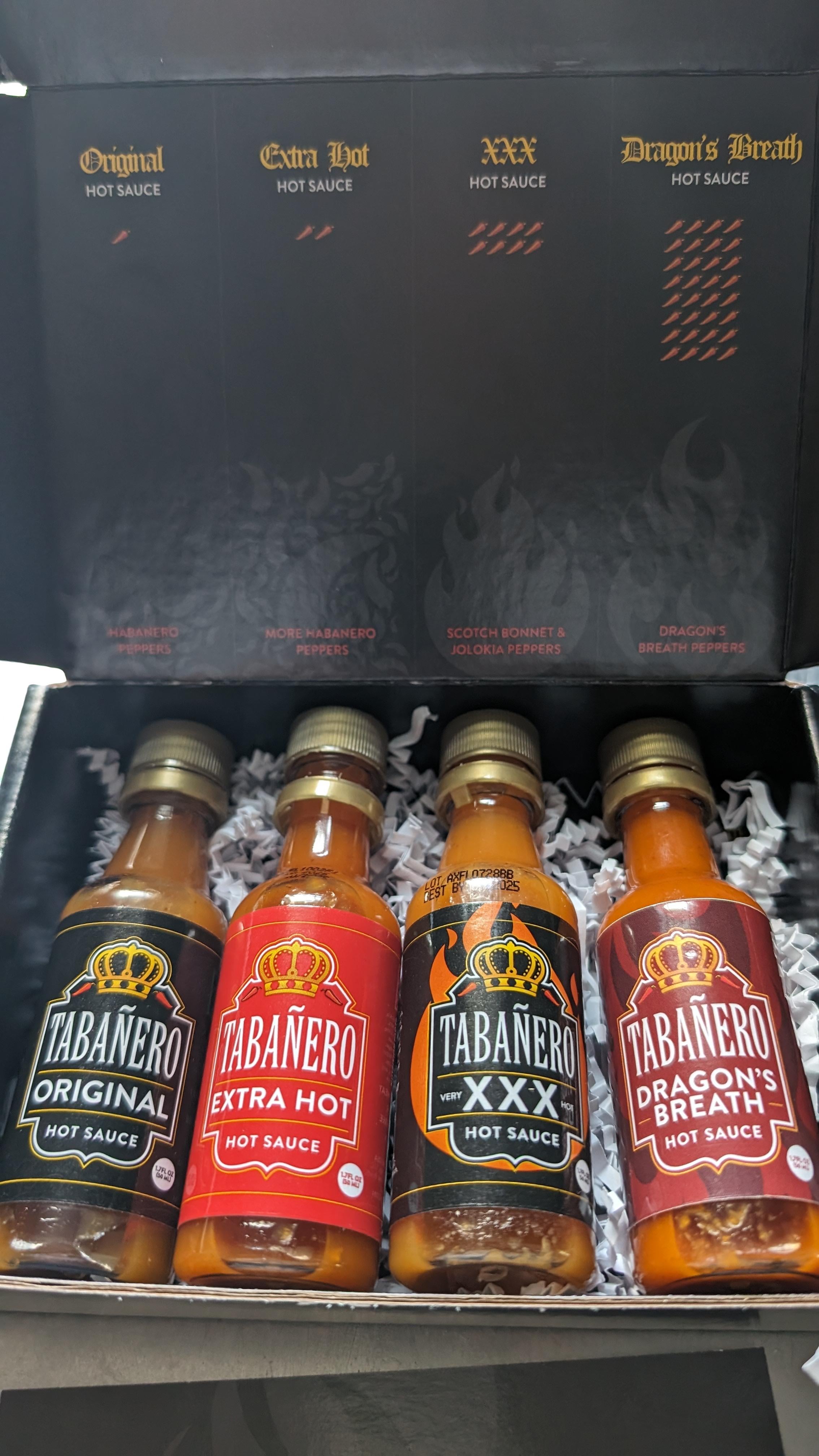 Hot sauce challenge I got for my birthday. Was afraid it was trash holiday season stuff, but quite tasty. The original is too mild. The extra hot a quite nice flavor. The XXX I didn't like as much. Dragons breath was tasty and damn hot. Print too small to read, but I don't think it has extract. $10 on Amazon. They have some other interesting flavors as well.
