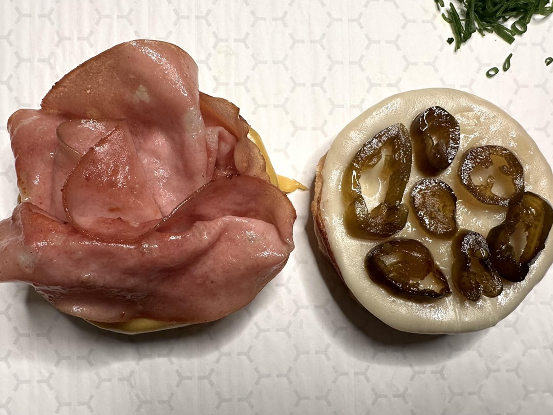 Another day off, another tasty breakfast sandwich. Soft scrambled eggs with scallions, pan fried mortadella, American and Provolone cheeses, and candied jalapeños on a buttered and griddled croissant bun.