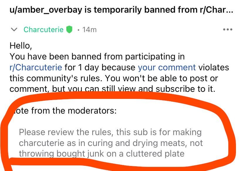 Accidentally posted in r/charcuterie instead of this sub and got this rude message almost immediately