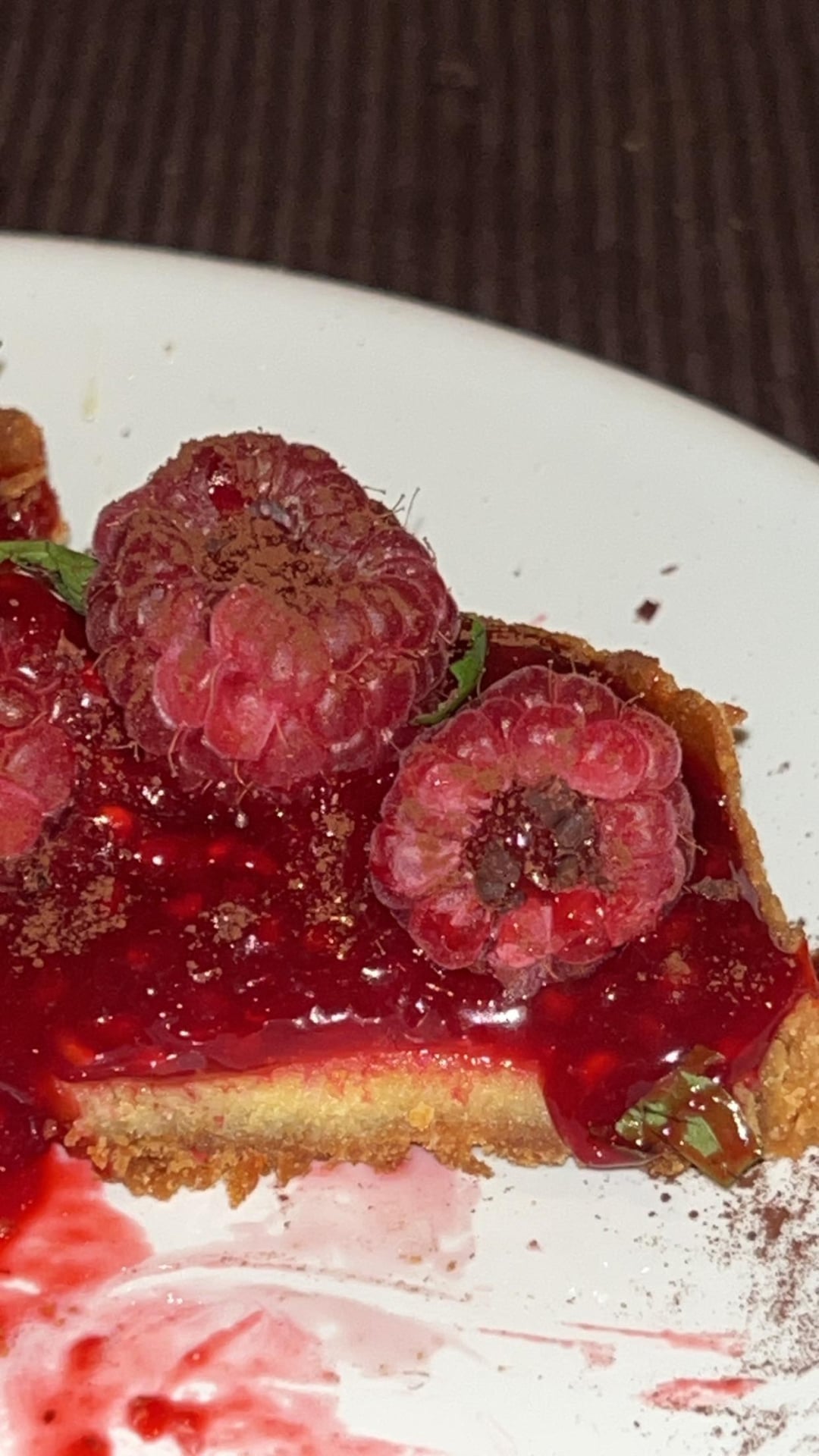 It is a raspberry tart. With a rumbased almond cream as the bottom layer then a raspberry compote. Topped with fresh rasberries. The raspberries are filled with raspbbery coulis. Then. It it is topped with fresh chopped mint aswell as cocoa powder and gratef 70% chocolate.