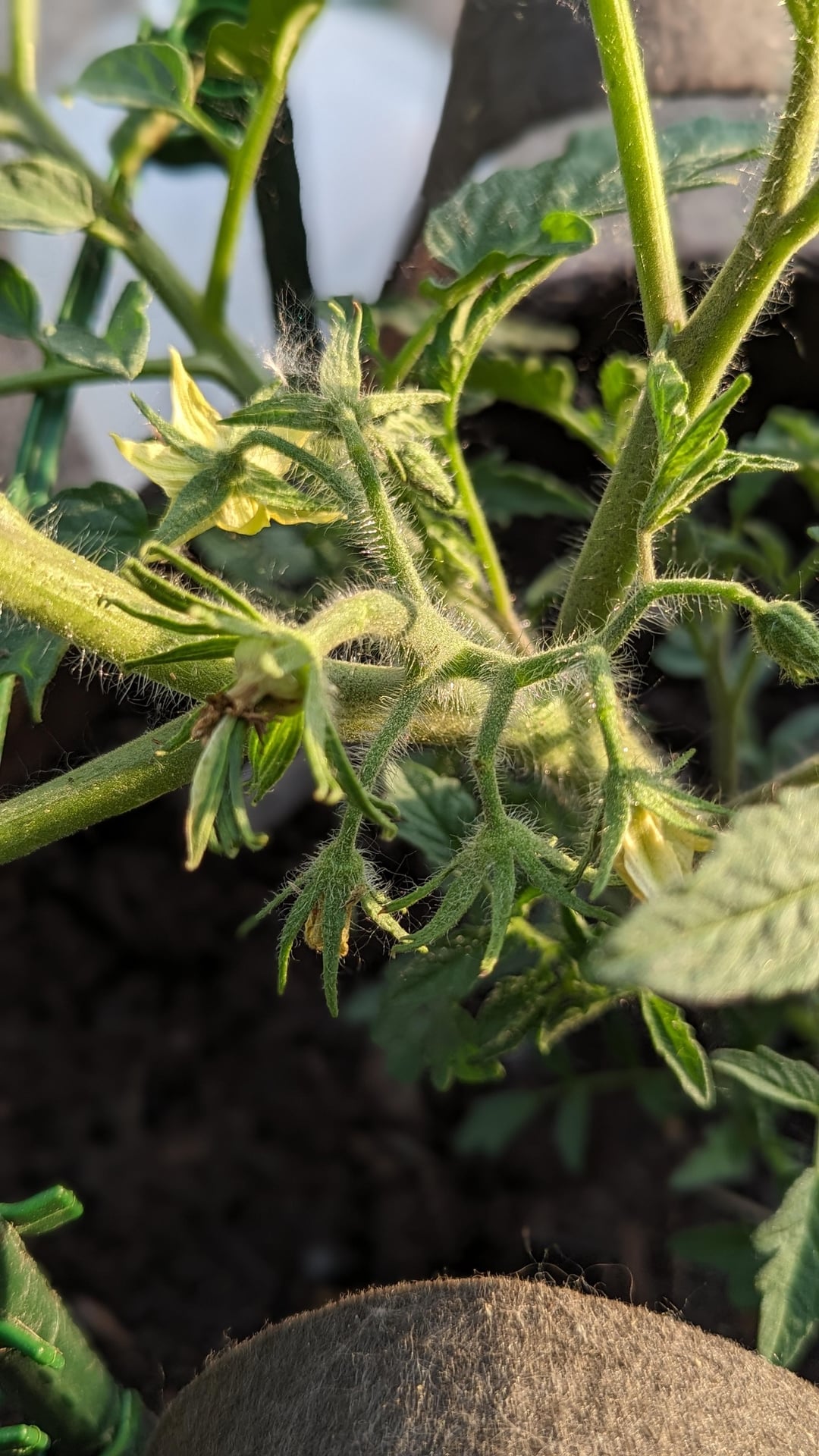 Hey all! I'm growing a Black Krim for the first time which is an heirloom-style tomato that is bound to have big fruits. This particular blossom is twice as big as the others, the stem of it included. I've never seen the green outer portion of the blossom come through the middle of the flower (there was a yellow flower) Is this a mutation? The rest of the flowers look normal .