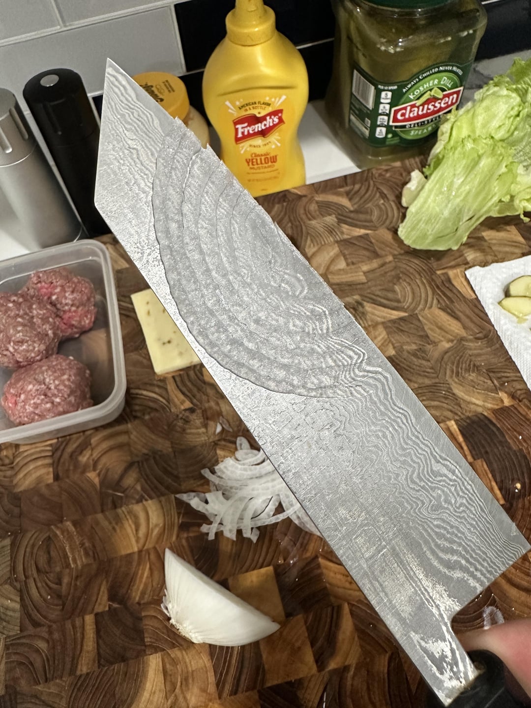 this picture cracks me up. $200 japanese knife, $400 end grain cutting board, and the world’s crappiest mustard lol