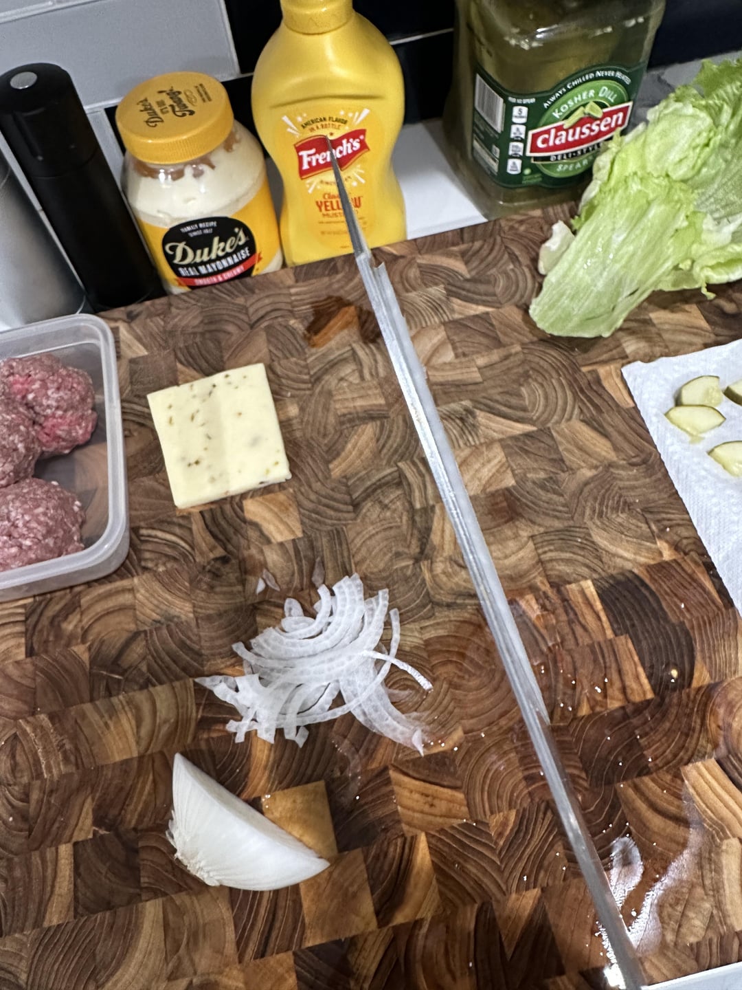 Duke’s mayo, claussen pickles, beautiful kiritsuke, and onions. This man knows good stuff.